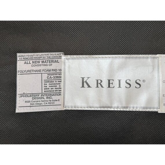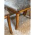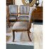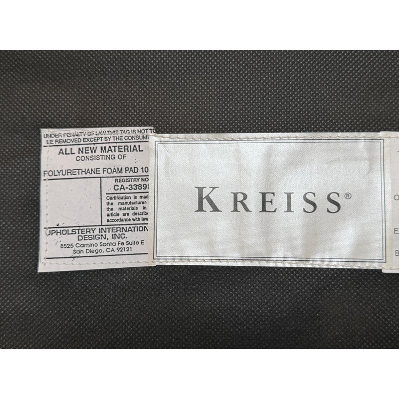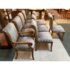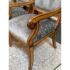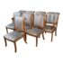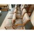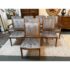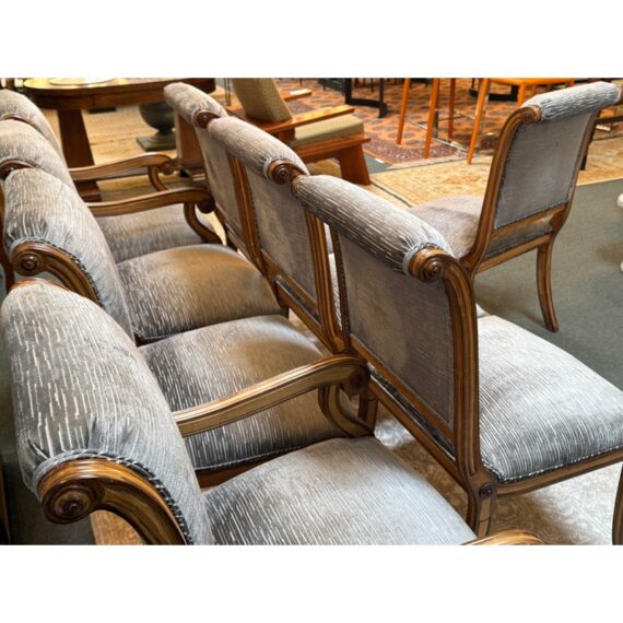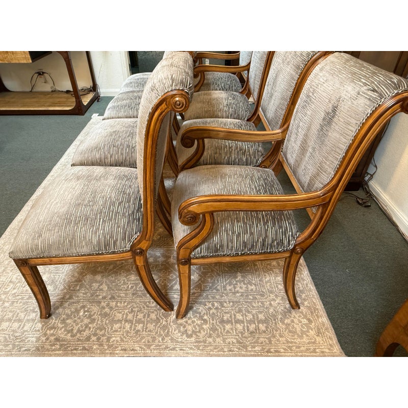Design Plus Gallery presents a Set of Eight Fleur De Lis Dining Room Chairs by Kreiss. The chairs have a French style with a twist due to their updated and contemporary fabric choice. Their frames are made of solid wood and the set includes two arm chairs and six side chairs. The upholstery is a striated gray with off white velvet that covers the entire seat back to front and the cushioned seat pad. Their wooden frames are shapes with a rolled, sleigh back and carved elements on the chair legs. They are all in good condition with wear that is consistent with usage.
