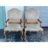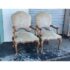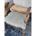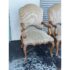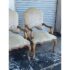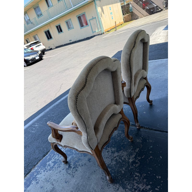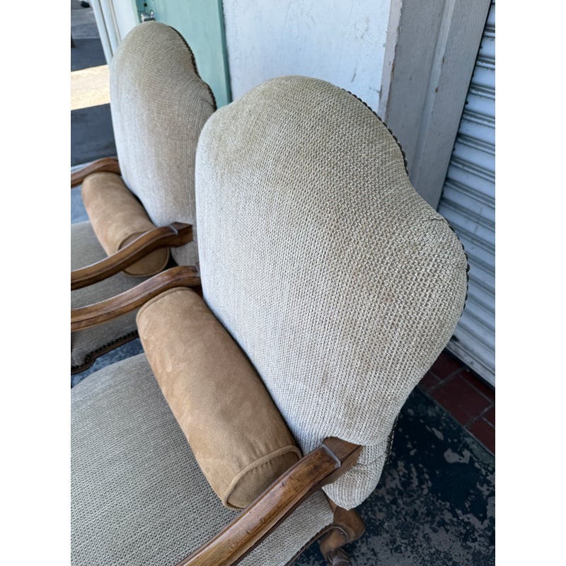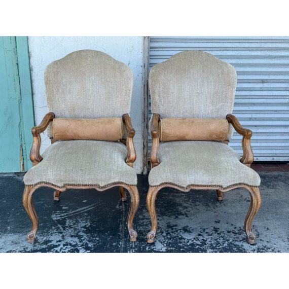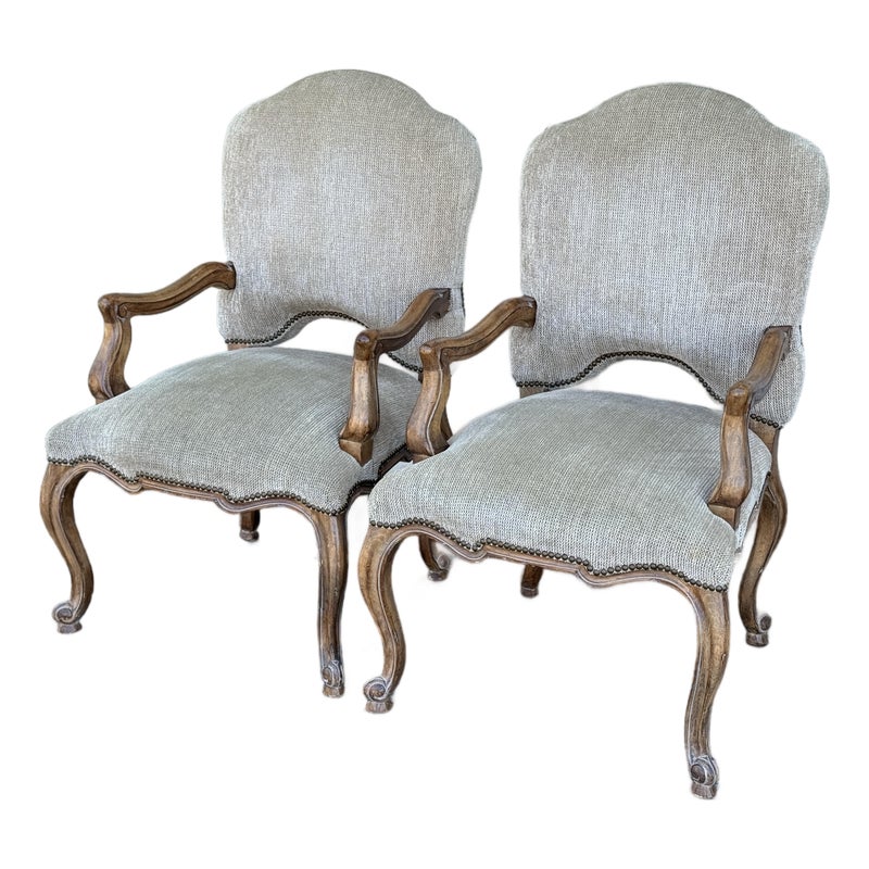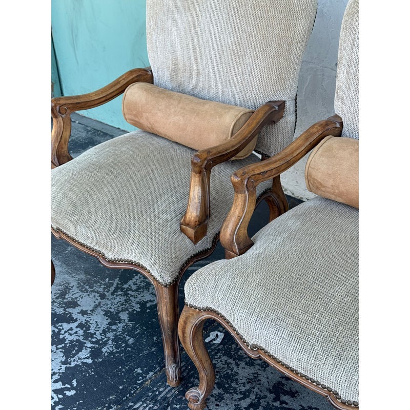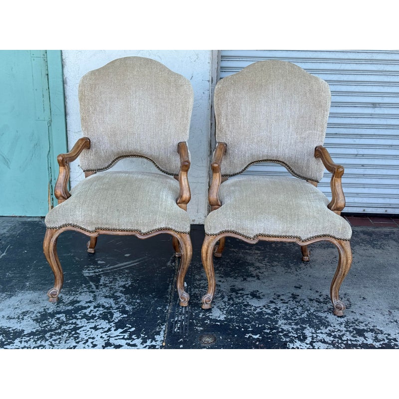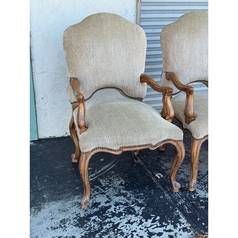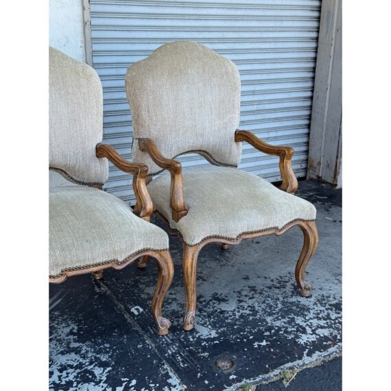 Design Plus Gallery presents a Pair of Palazzo Arm Chairs from Kreiss Furniture. The pair of chairs has a classic look of an Italian antique, perfectly suited for entertaining on a grand scale. Hand carved from solid hardwoods and upholstered in a soft, creamy tone of henille. The chairs have been finished with a brass hob nail trim. They are in good condition with light visible wear on fabric from usage. Made in USA.