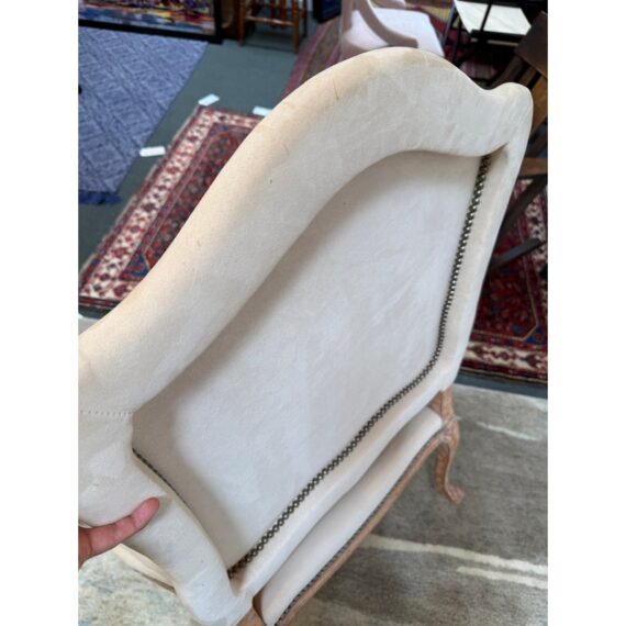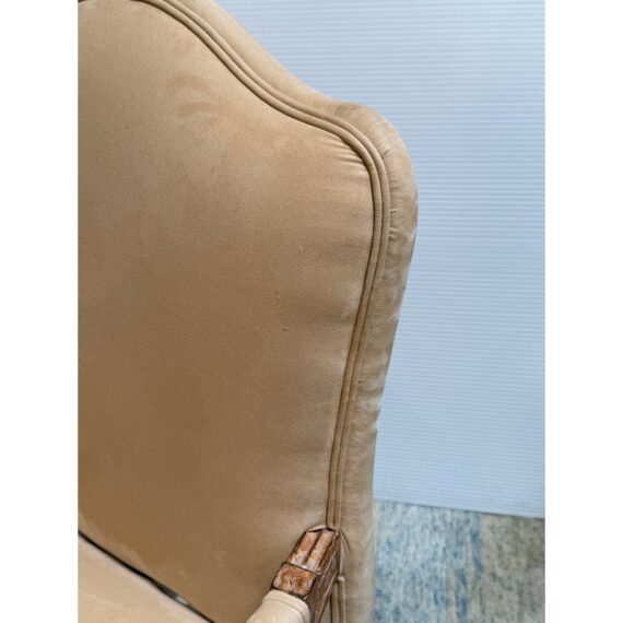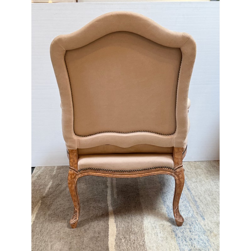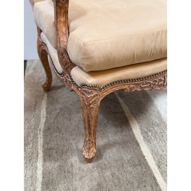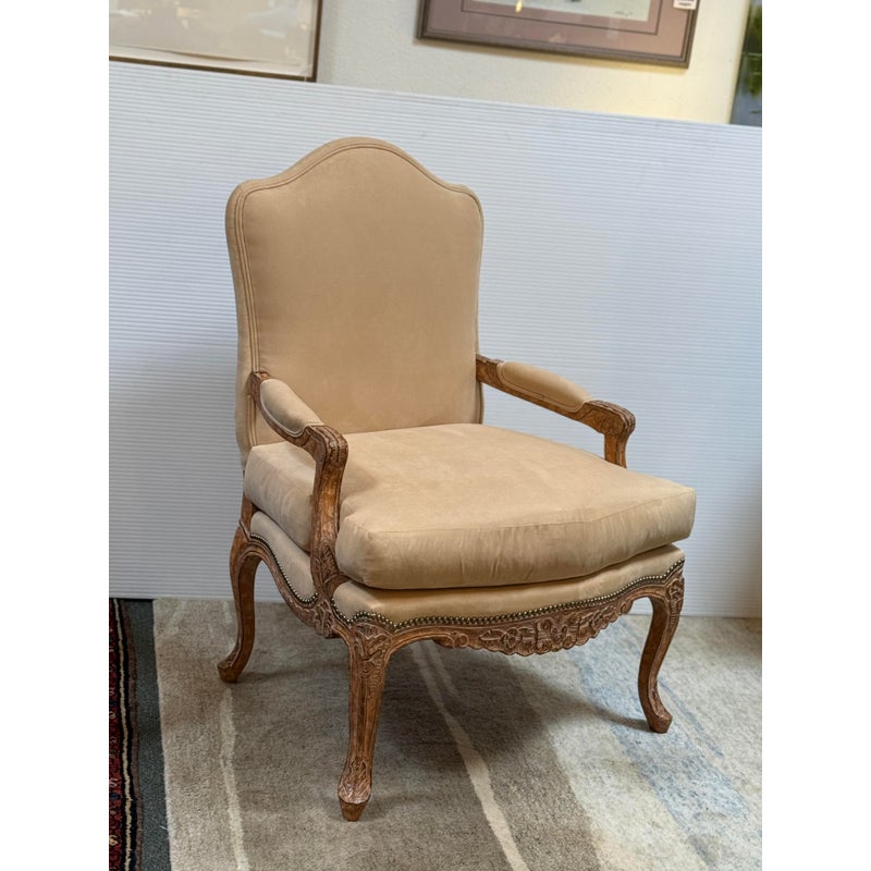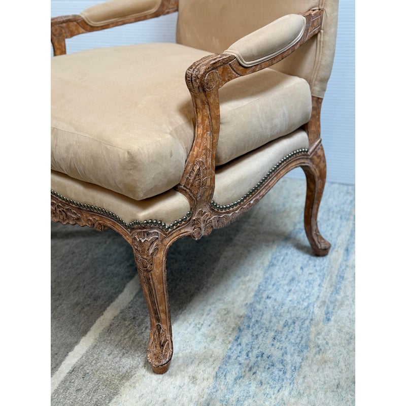 Design Plus Gallery presents the Marquesa Lounge Chair from Kreiss. Talk about wonderful comfort, you can relax in this lounge chair. Feather and down filled cushions rest upon the oversized hand carved wood frame infusing comfort and elegance. Camel suede is attached to the seat back and seat rest with the use of nailhead that is visually appealing and aids in maintaining the upholstery. It is in good condition with brand sticker on its base. Made in the USA.