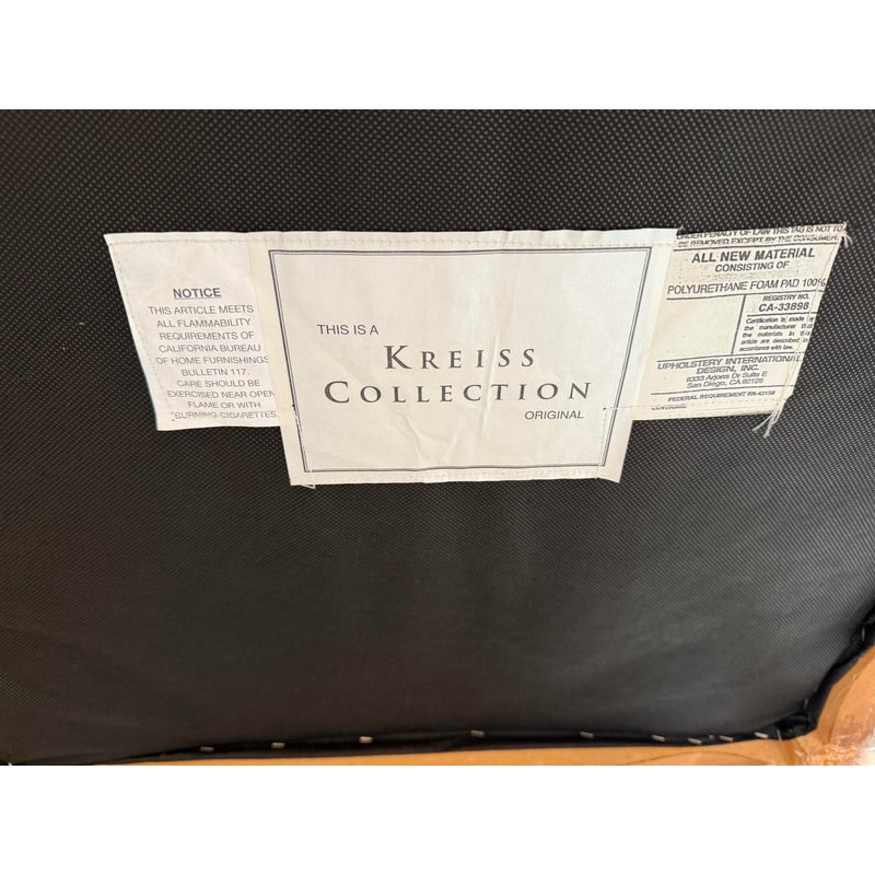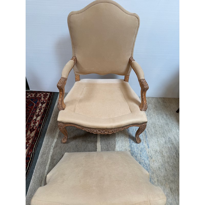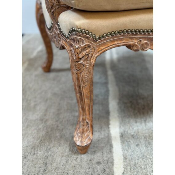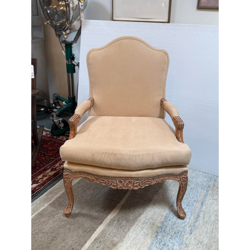 Design Plus Gallery presents the Marquesa Lounge Chair from Kreiss. This lounge chair offers a delightful sense of comfort. The oversized hand-carved wood frame provides a sturdy base, while feather and down-filled cushions envelop you in a cloud of comfort and elegance. The seat back and seat rest are adorned with camel suede, adding a touch of visual appeal and helping to maintain the upholstery. It is in good condition with brand sticker on its base. Made in the USA.