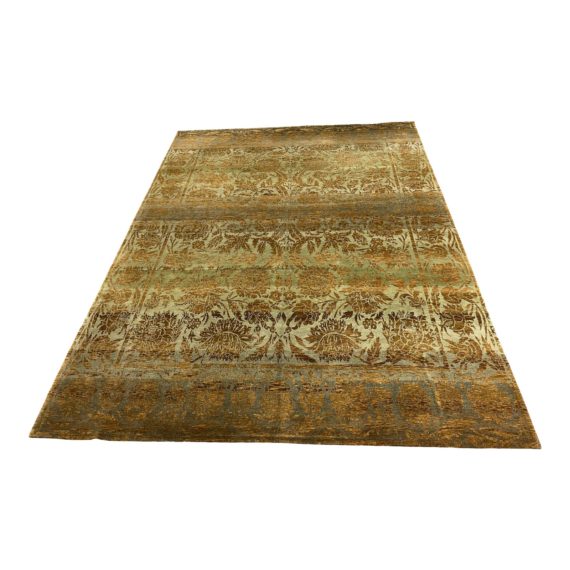 Design Plus Gallery presents a 9 X 12 Contemporary Floral Damask Nepalese Wool Rug. The design is Daware Sage. Hand made with an earth and rich palette of Himalayan wool fibers. Construction is hand made is 100 knots per square inch. Background field is a light ombre of dusty and sage greens. A large scaled Floral damask dances on top of the green field in a bronze tone mirrored down the center. Perimeter is highlighted with a thick border. Hand made in Nepal. Originally purchased from Krisma in San Francisco.