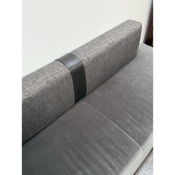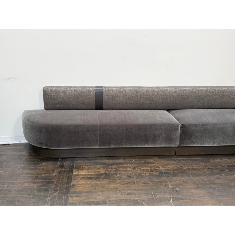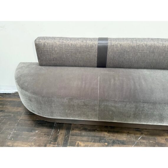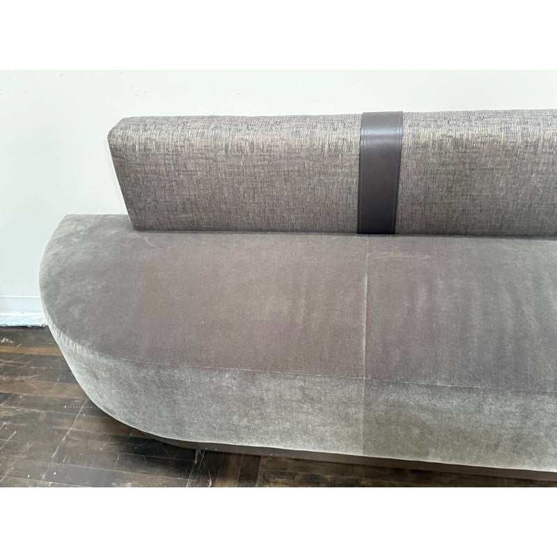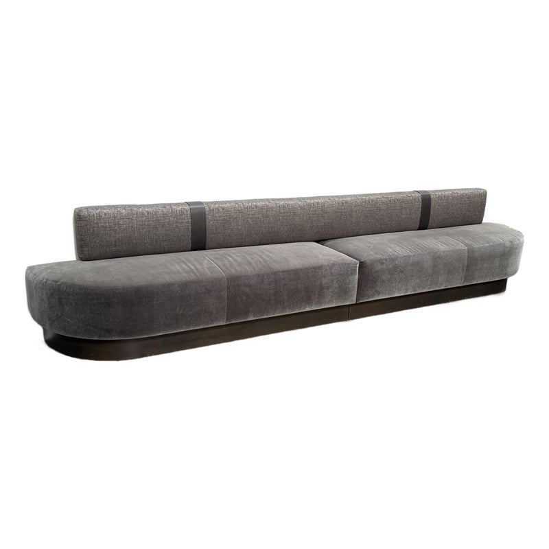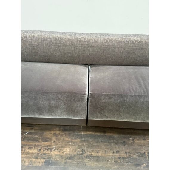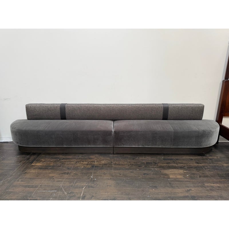 Design Plus Gallery presents a Custom Design Two Piece Banquette from Kroll Furniture. The bench seating is upholstered in two contrasting fabrics. The bench seat is covered in gray velvet while the back rest is fixed with a woven metallic gray textile. This substantial banquette is composed of two adjoining sofa sections, joined at the center by a leather band that neatly conceals the seam while adding a tailored visual break. The piece is designed to sit flush against a wall and includes wall-mount capability, making it well suited for dining banquettes, commercial interiors, hospitality settings, or large residential spaces. A wood plinth base in a deep bronze-toned coloration supports the generous scale of the seating. In good condition, visible and minimal wear from usage. Made in theU SA.