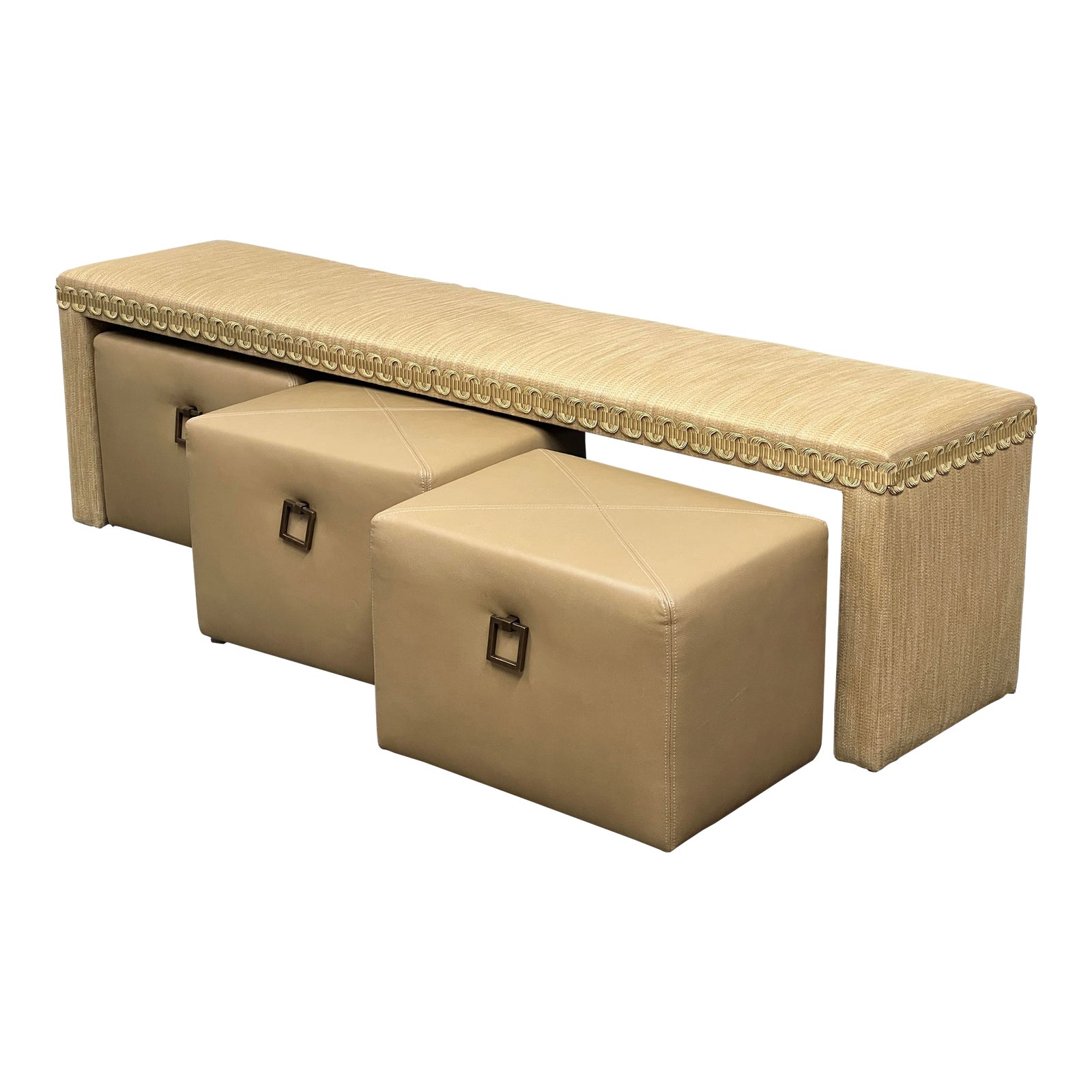 Design Plus Gallery presents a Custom Design Sand Linen Bench + Three Mobile Leather Ottomans by Kroll Furniture. Smart design + space saver to add additional seating to any room you desire in your home. Neutral tones with lux fabrics will make this an easy transition piece of furniture. Minor wear from usage. Made in San Francisco, USA.