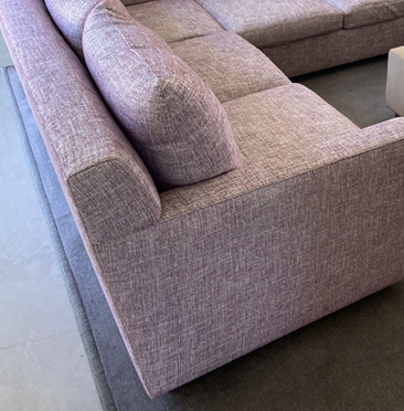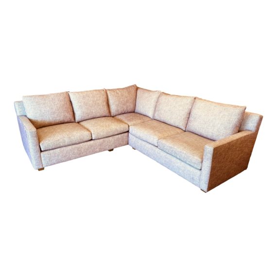 Design Plus Gallery presents a large Custom Sectional from Kroll Furniture, San Francisco. Classic and contemporary, the three pieces are built to last, with hardwood frames, hand-tied springs and cushions designed for the ultimate in comfort hand tied springs and hardwood frame. Lovely woven fabric, wine/white, has a soft hand. Down and feather cushions offer luxurious comfort. Interesting option for longer or shorter “wing”.
