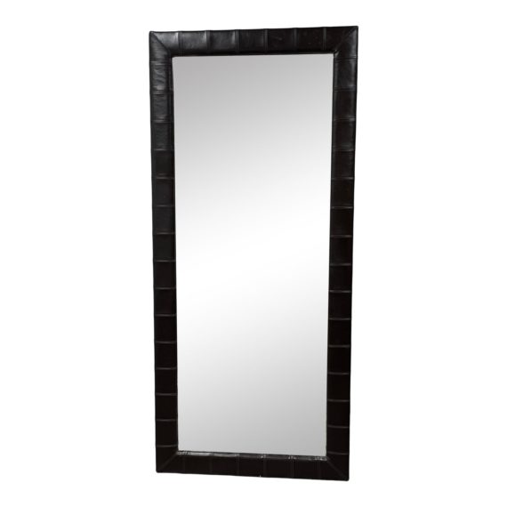 Design Plus Gallery presents a Kuka Bonded Leather Floor Mirror. Espresso tones bonded leather is patched around the softly padded perimeter. Large enough to lean casually on a wall in a bedroom or closet. Optional clip on top of mirror for attaching onto a wall. Requires additional hardware for wall mounting. Visible wear and minor wear on frame.