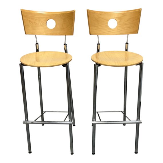 Design Plus Gallery presents a Pair of Kusch + Company Maple Finish Barstools. Constructed with wood in a maple finish. The frames are constructed with aluminum rods. The seat is circular, and the back rest is curved with a circle opening in the center. The base has a decline from the front to back. Minor wear from use; bar stools are in good condition. Made in Germany.