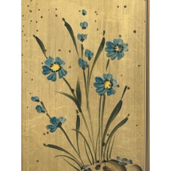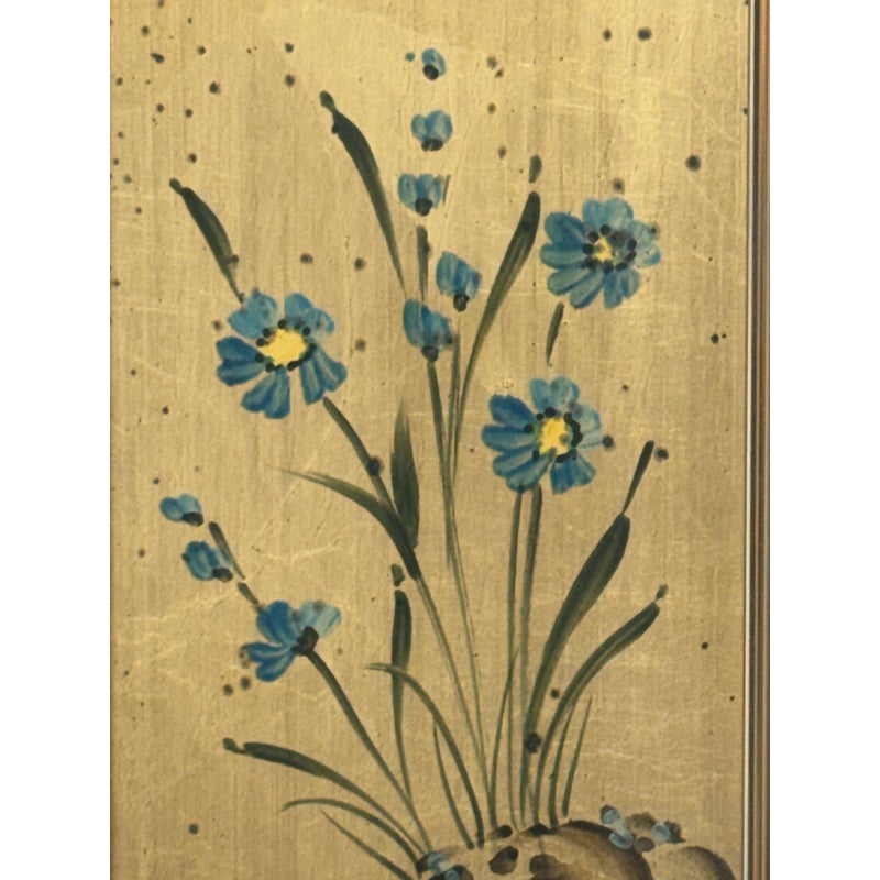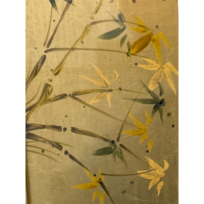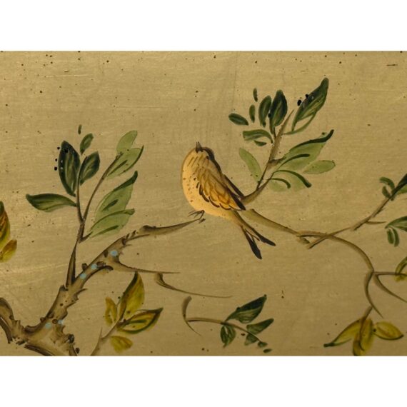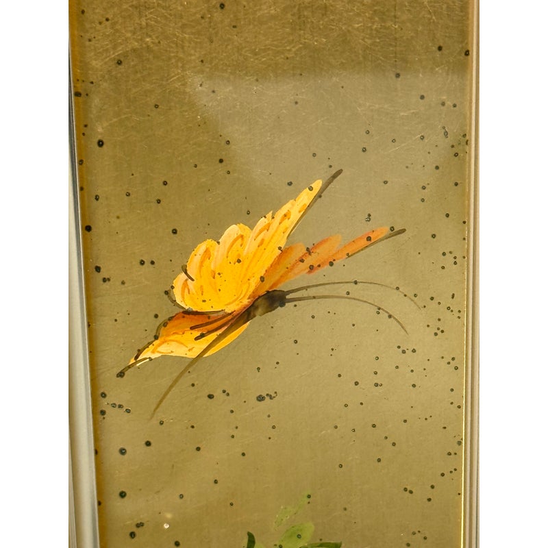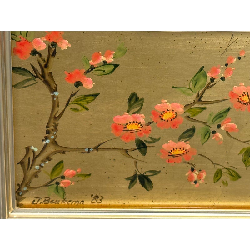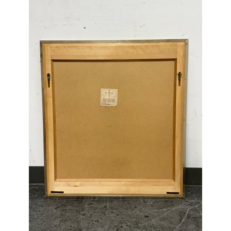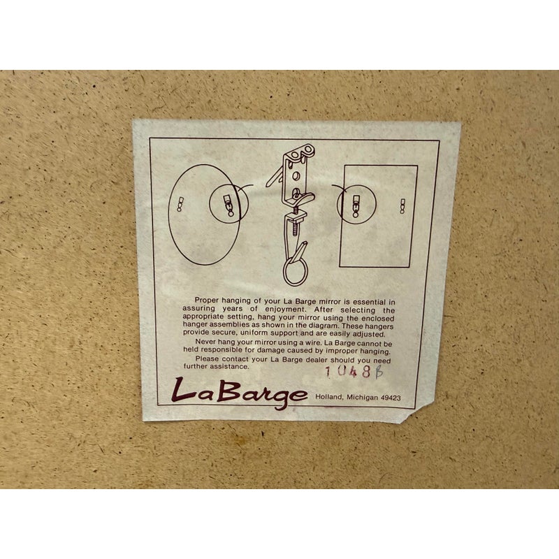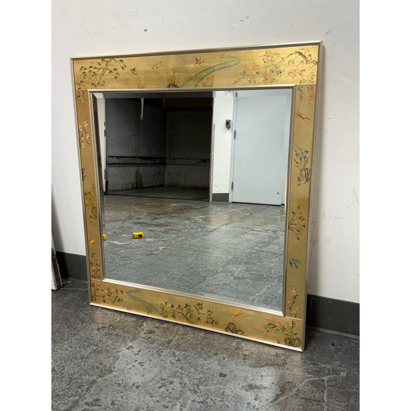 Design Plus Gallery presents an Eglomisé Chinoiserie Wall Mirror from La Barge. This is a decorative statement mirror that blends traditional Asian-inspired motifs with late 20th-century American design. The reverse-painted glass surround showcases hand-rendered scenes of flowering branches, birds, and winding landscape elements, all set against a luminous gilt ground. The églomisé technique lends depth and variation to the imagery, with fine brushwork and subtle patina visible throughout. The square form is bordered by a slim metallic frame that neatly contains the artwork while allowing the painted glass to remain the focal point. This mirror is signed by the artist on the bottom left, J. Beaukerna ’83, adding a collectible, studio-art quality to the piece. It is in good condition, with visible and minimal wear from usage. Made in the USA.
