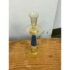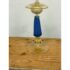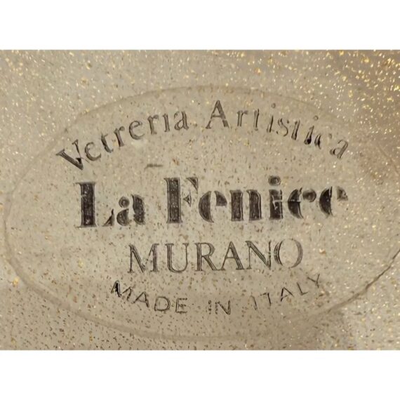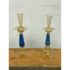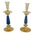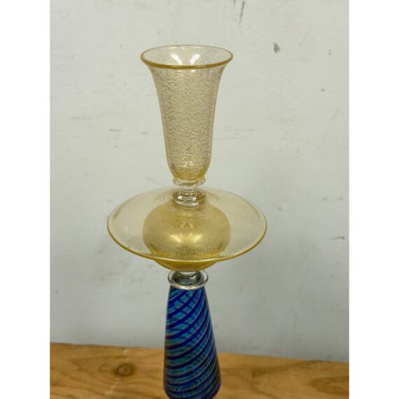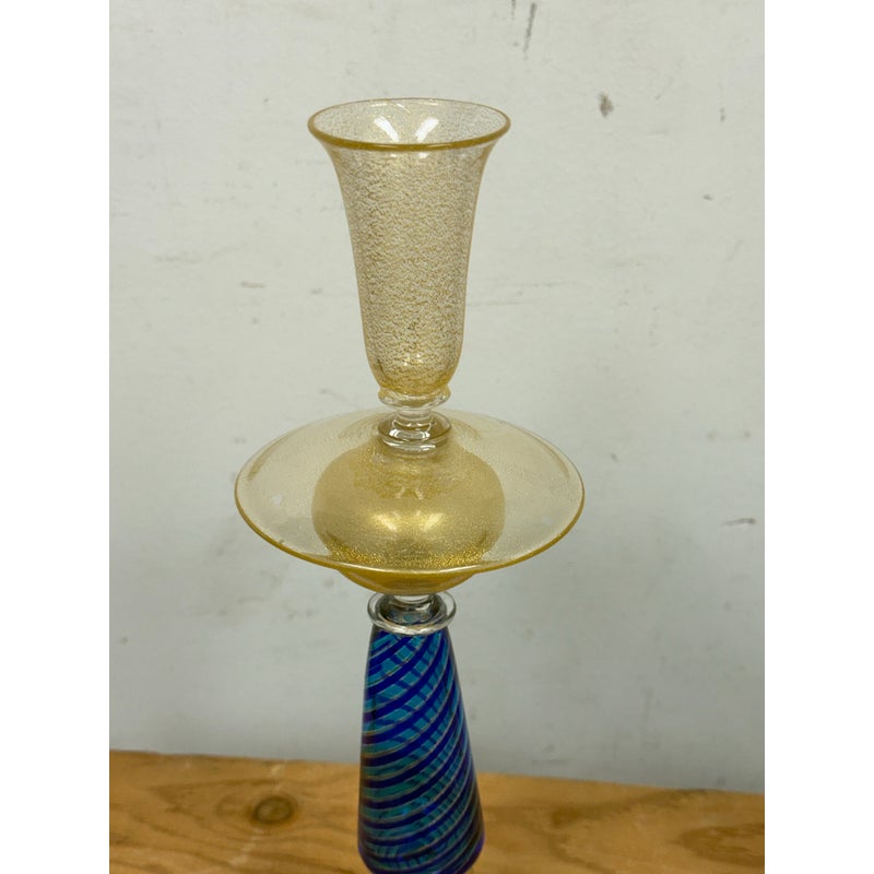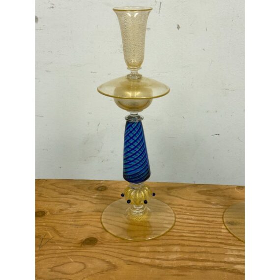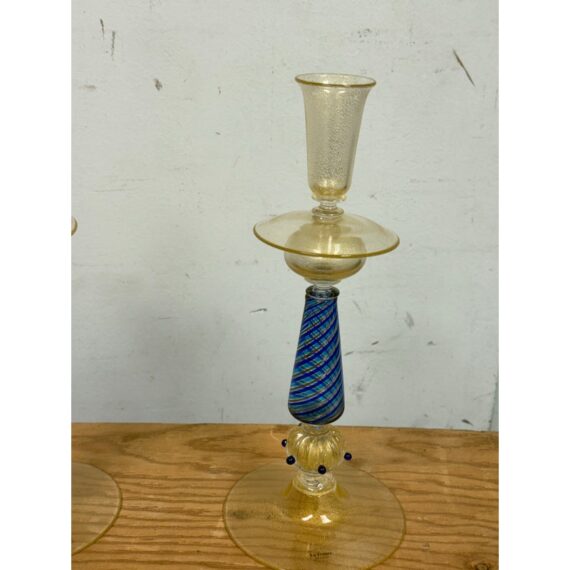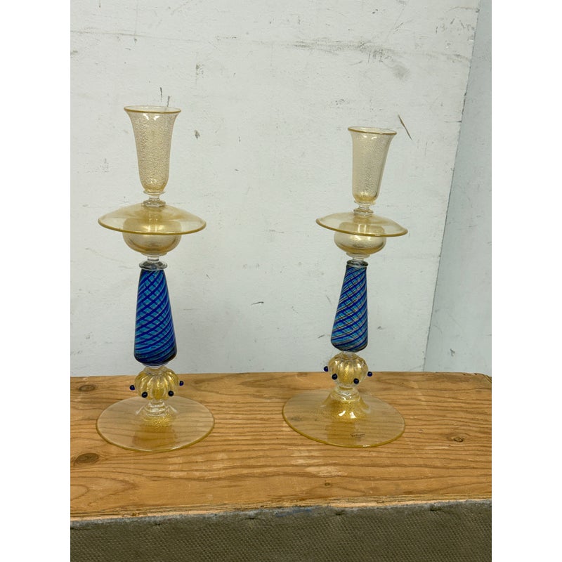 Design Plus Gallery presents a Pair of Candle Holders of Murano Glass from La Fenice. Truly hand made and one of a kind, the candle holders have blue in the base of gold with a playful, spiraling design style. The transparent glass mostly has a color of gold spun into them that casts a pleasant glow to their bodies. Playful blue dots are found at the bottom ring below the blue filigrana. Overall the candle holders are in good condition with minimal wear for their usage. Made in Italy.