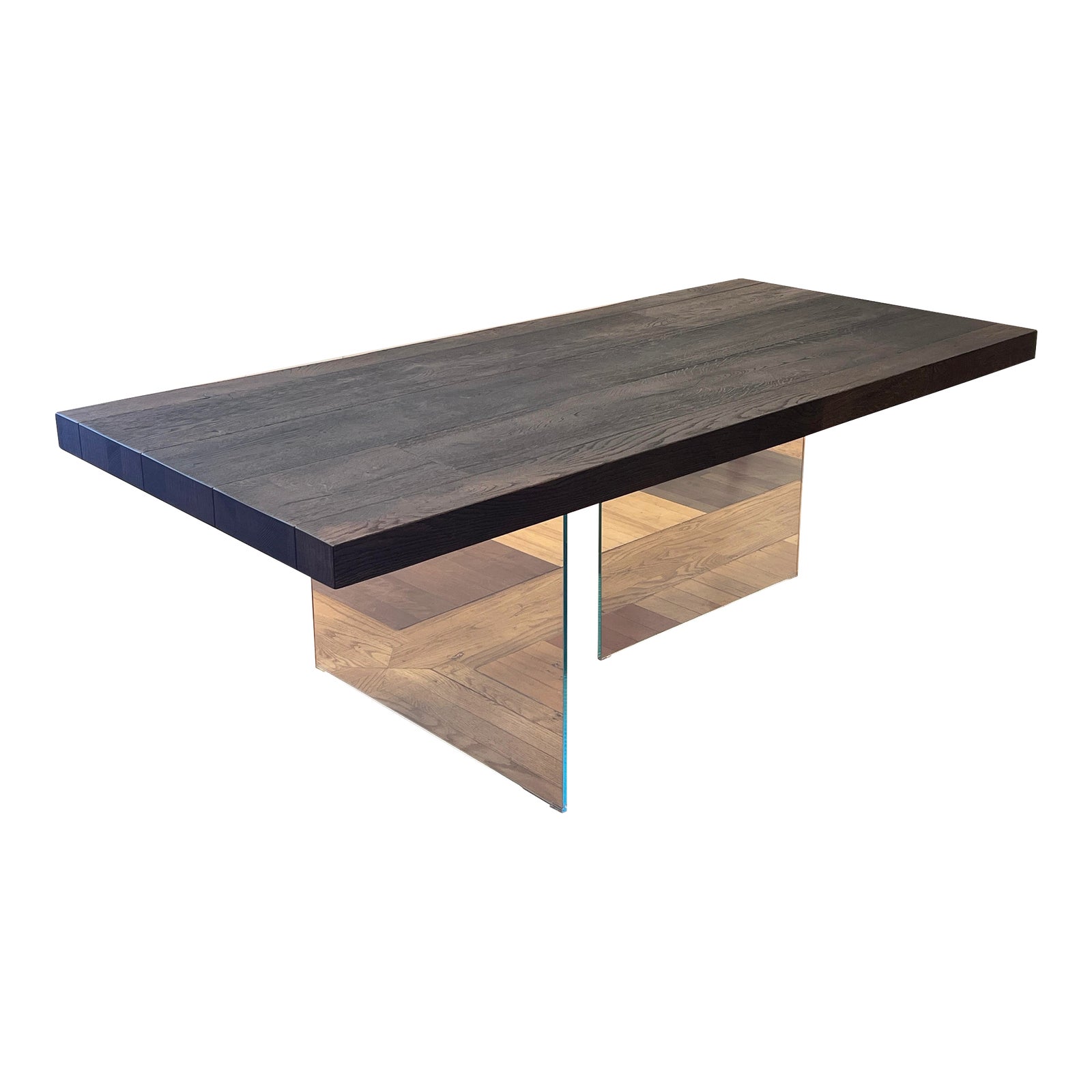 The extra-clear tempered glass creates a sensation of airiness and brings light to the room. The heat-treated centuries-old oak wood contributes an air of history and major resistance, while creating an original contrast between weighty material and the glass legs. Is in good condition, with minimal signs of wear.