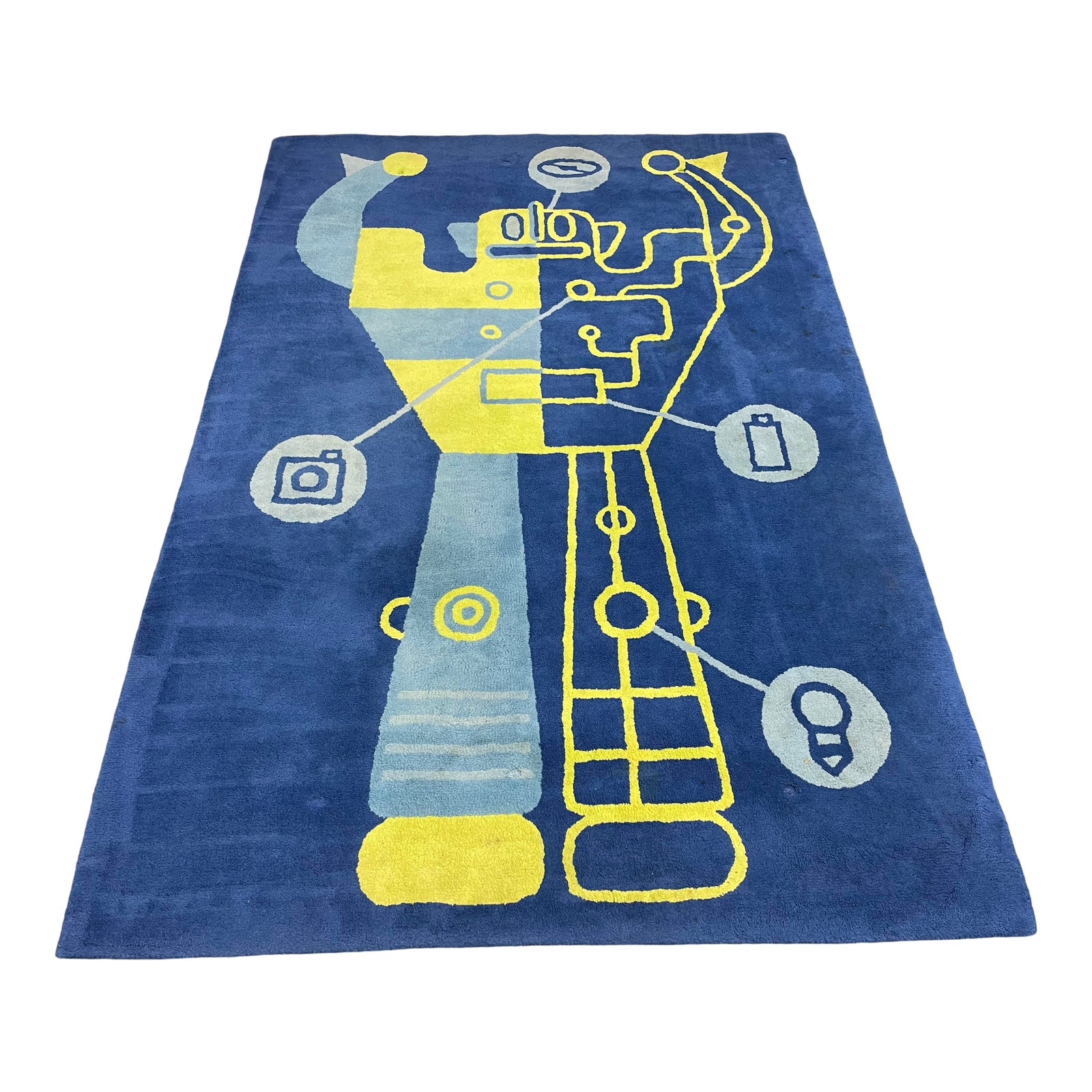 Design Plus Gallery presents a 5′ X 7′-8″ Land of Nod Wool Robot Rug. Navy, pale blue and neon chartreuse are constructed in a tight and low pile with wool fibers. Visible wear through out, rug is in good condition. Made in India.