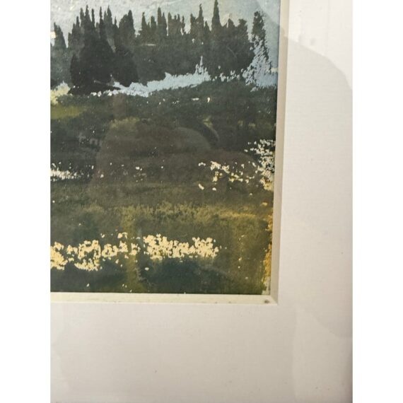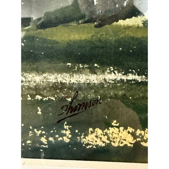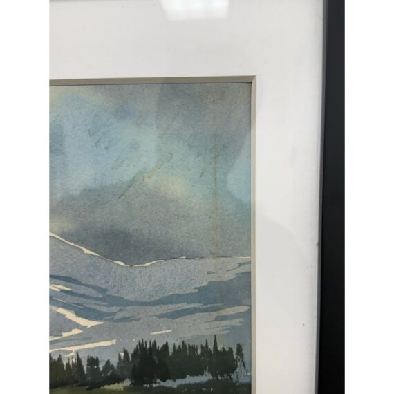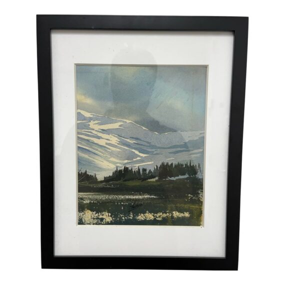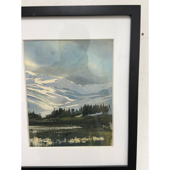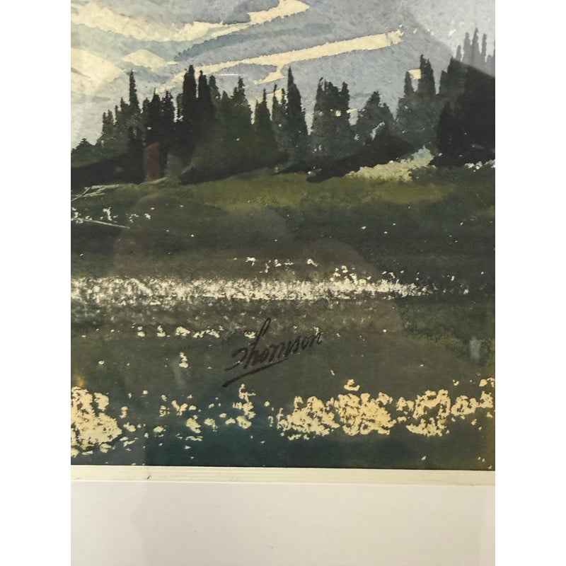 Design Plus Gallery presents a Signed Watercolor of the Valley of a Mountainside. White snow capped mountains are in the distance with a light blue sky. The valley is green with tall tress in the background. This art piece is signed on the lower right side with Thomson and encased in a black frame. It is in good overall condition for its usage.