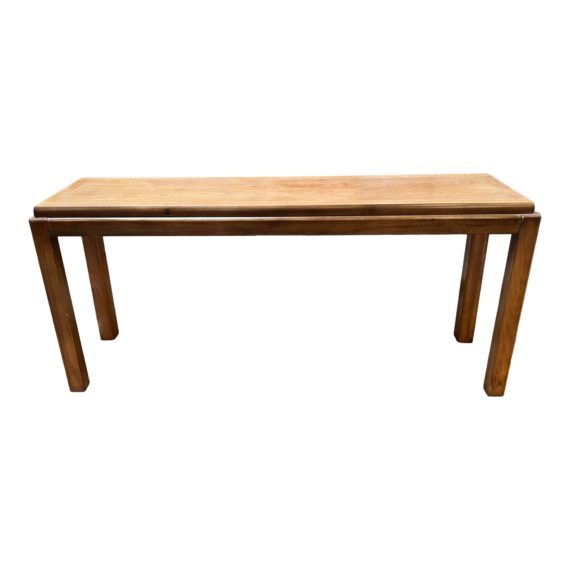 Design Plus Gallery presents the Lane Altavista Wood Console Table. Features clean lines and Mid-Century Modern style. Four rectangular legs hold up the rectangle tabletop. Wear is consistent with use; console is in good condition. The legs and apron stick out about a half inch further than the tabletop.