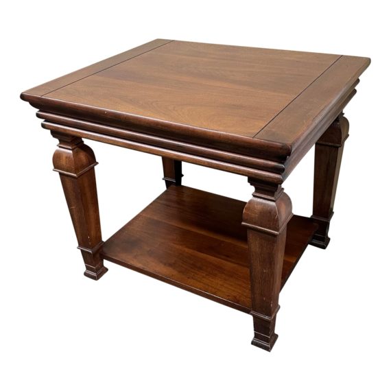 Design Plus Gallery presents a Traditional Side Table by Lane Furniture. Handcrafted in the USA, this classic table features wide plank surface aand carved legs with a full lower shelf, all of solid richly-stained walnut. Built to be, and cared for as an heirloom, the scale makes it a welcome addition in may spaces. LIttle evidence of wear; overall good condition.