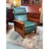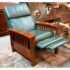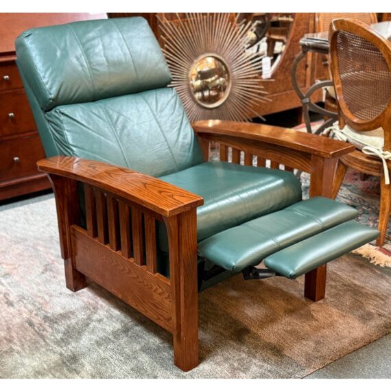 Design Plus Gallery presents a Walnut-Stained Oak Recliner Chair Made by Lane Furniture. Arts and Crafts Mission style with supple full grain pine green leather, spindle sides, and manual recline mechanism. In good condition with visible and minor wear consistent with age and use. Made in USA.