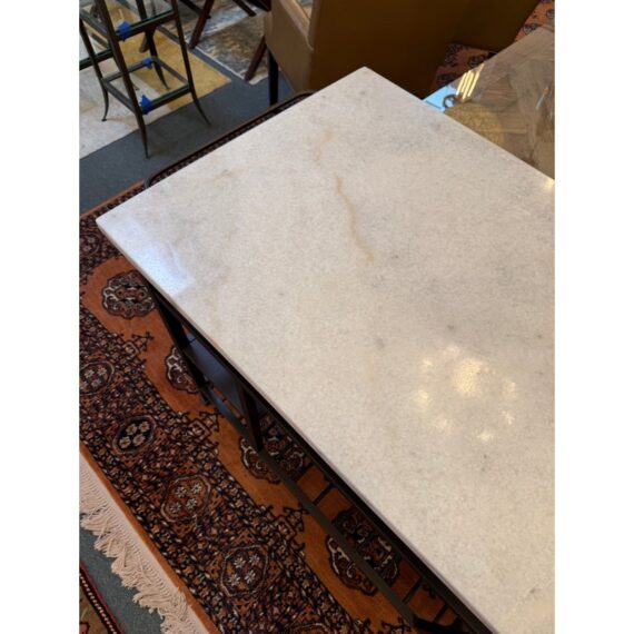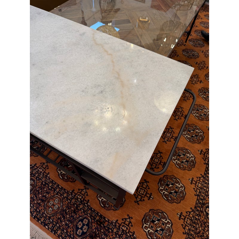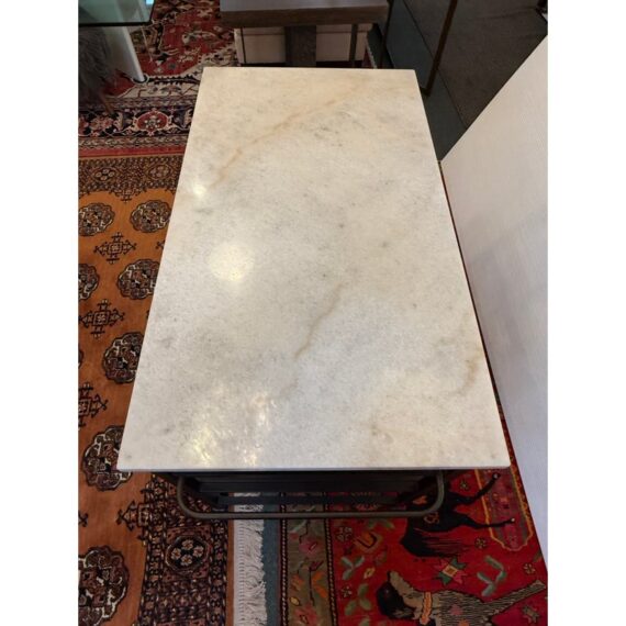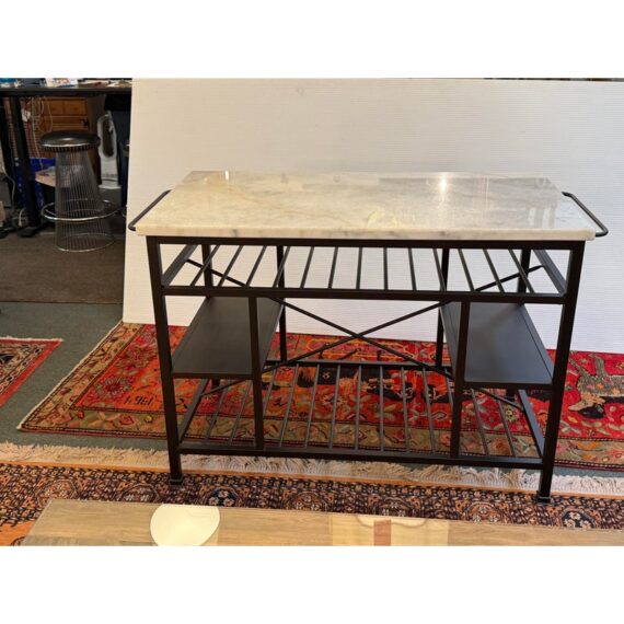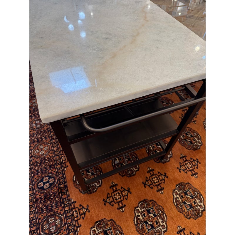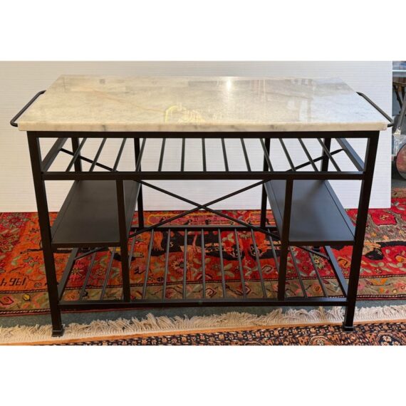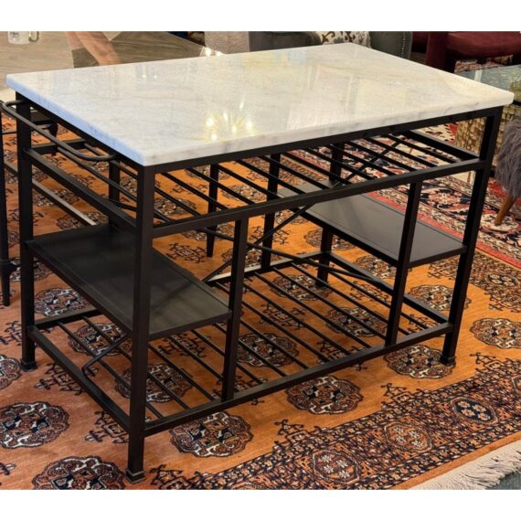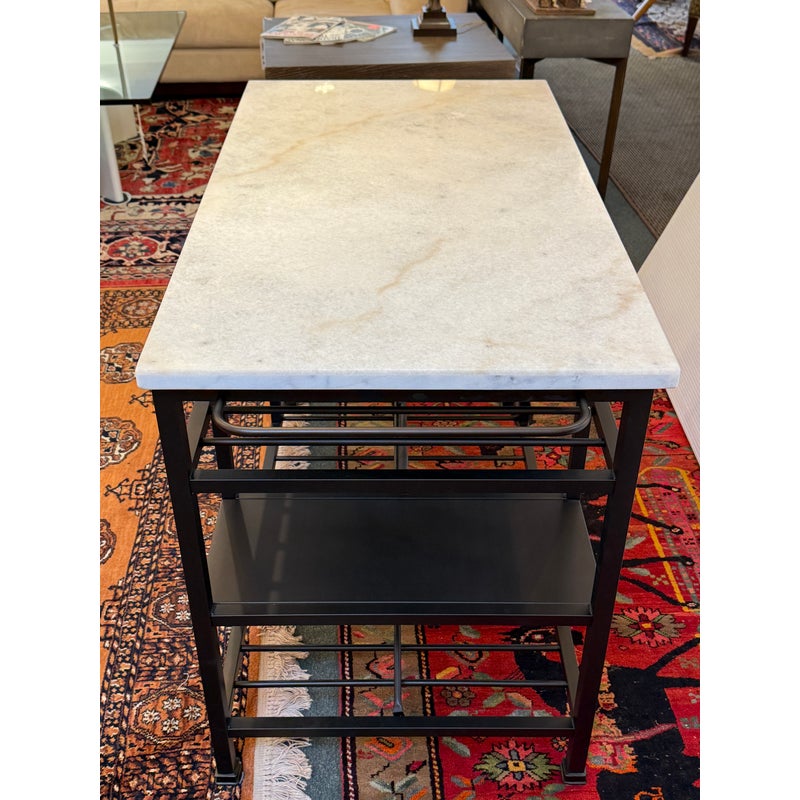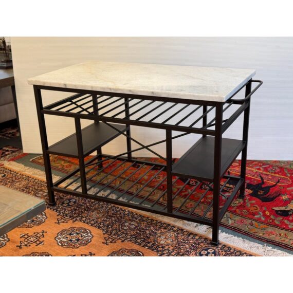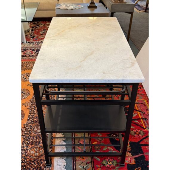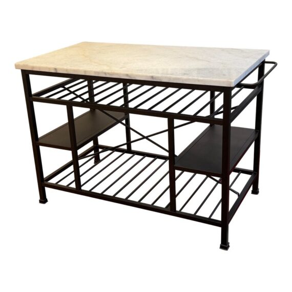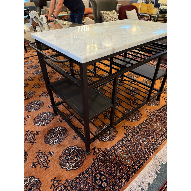 Design Plus Gallery presents a Marble + Metal Kitchen Island from Lanzo. A simple, modern silhouette with industrial fittings and a white marble countertop for a clean, contemporary look. Built with gunmetal-finish metal, its sturdy construction provides lasting durability and stands up to everyday use. An open compartment keeps essentials within easy reach, making prep and serving seamless. In good condition, visible and minimal wear from usage and age.