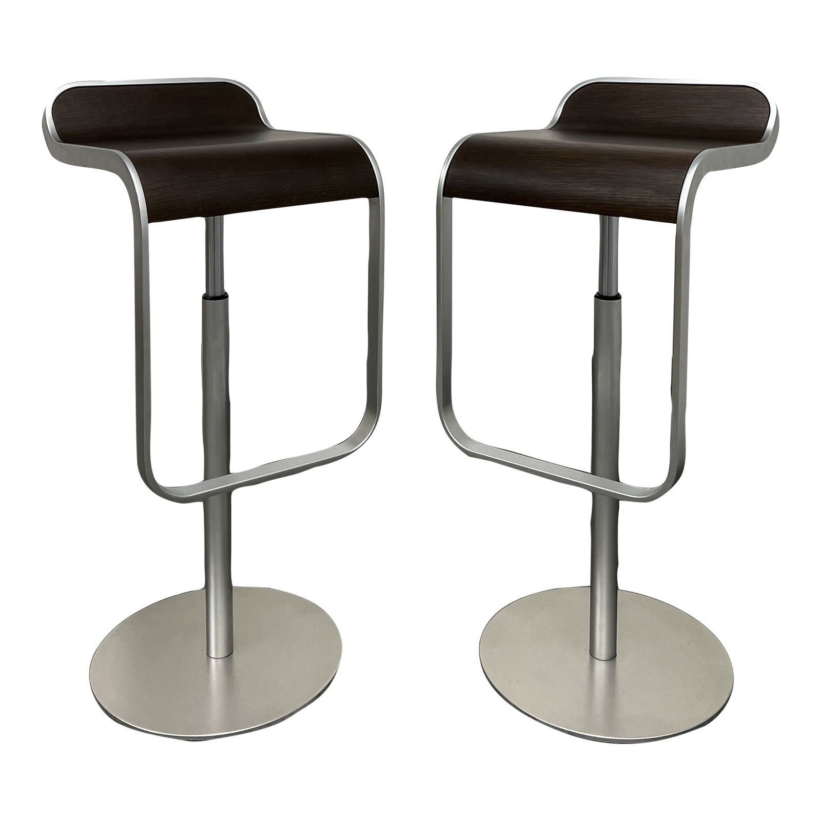 Design Plus Gallery presents a Pair of Walnut LEM Piston Adjustable Stools by LaPalma. Designed in 2000. The height of functionality, strikingly sleek and airy, features a sculptural seat that not only swivels smoothly, but also adjusts from counter height to bar height and back again with a gas-lift cylinder. These beauties are non upholstered seats in a walnut finish, the frame is a stainless steel finish. Once named Product of the Year at the FX International Interior Design Awards in the year of its release. Its visual lightness that creates the illusion of freedom from gravity. LEM is included in the permanent collection at the Victoria and Albert Museum. There is minor wear through out, pair is in good condition. Made in Italy. Designed by Shin and Tomoko Azumi