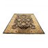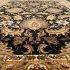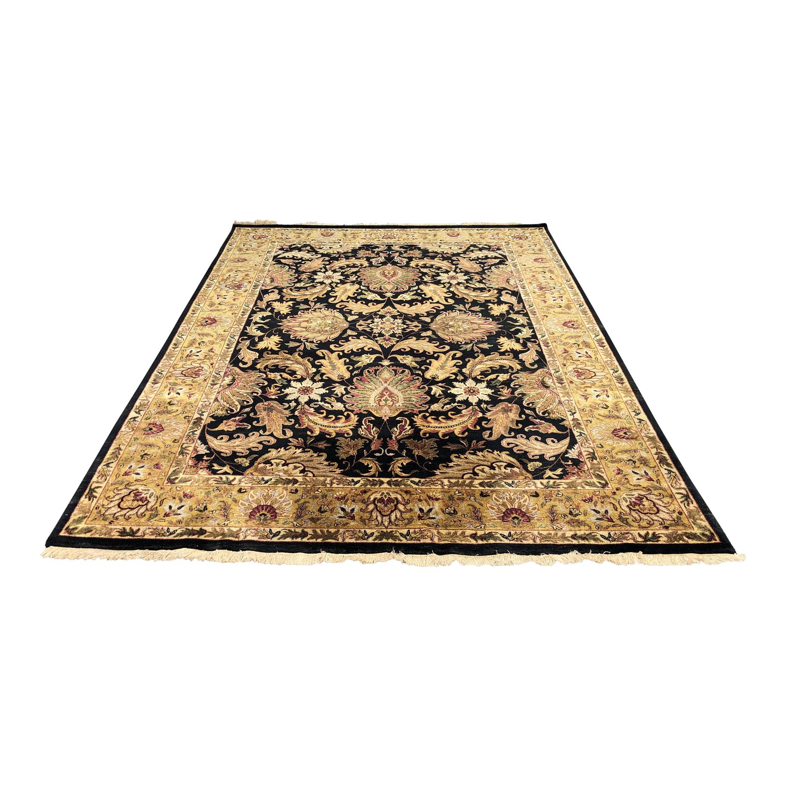Design Plus Gallery presents a large patterned area rug. Intricate floral designs are woven so densely as to almost appear as needlepoint. Lovely warm hues of Carmel, ivory, burgundy and sage green, are vibrant against the black background