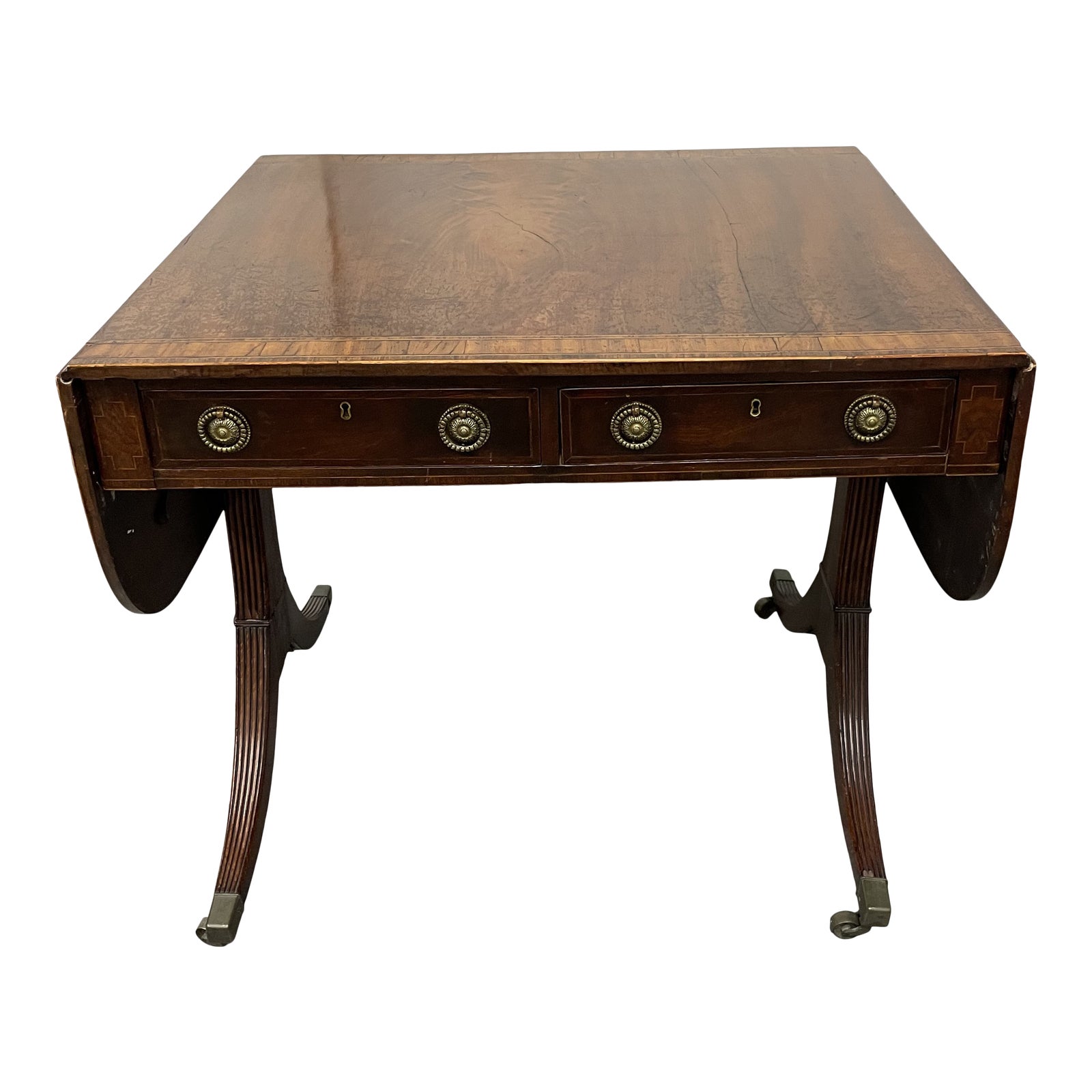 Design Plus Gallery presents a Late 18th Century English George Drop Leaf Side Table. Castor leg double pedestal base is connected by a trestle with reeded veneers. An intricate inlay adorns the top and drawers. Petite scale and efficient drop leafs would serve a small space and multi purpose room well. Drawers are on one side with a faux finish on the other. Oiled brass hardware completes the old world look and hand crafted quality. There is visible wear and the original key is missing. Side table is in good condition.