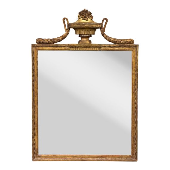 Design Plus Gallery presents a Swedish Gustavian Giltwood Mirror from the Late 18th Century. This Swedish wall mirror features a rectangular giltwood frame, adorned with delicate bead molding surrounding the mirror plate. The upper section of the frame attracts all the attention with its exquisite urn, wheat blades and bouquet details. Highly influenced by the Louis XVI style, this mirror shows a neoclassical influence that will enliven any wall beautifully. With its lovely proportions and timeless elegance, this Swedish period Gustavian mirror circa 1780 will complement any décor, perhaps placed above a commode, demilune table or buffet.