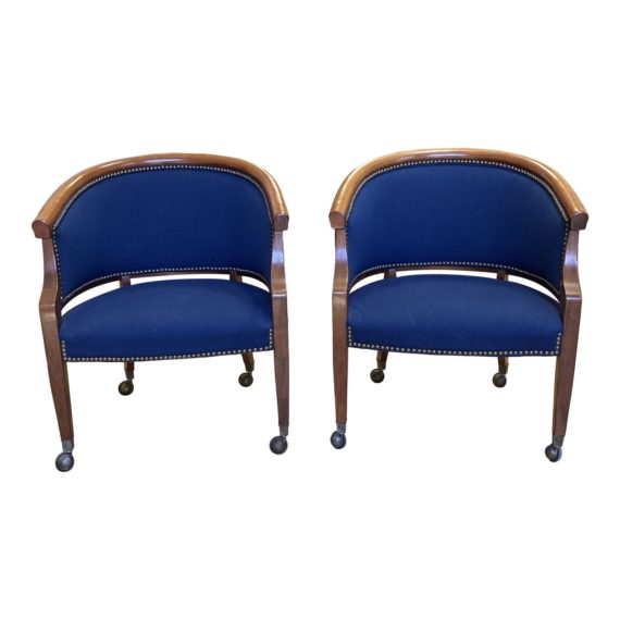 Design Plus Gallery presents a Pair of Post Modern Comdisco Barrel Chairs + Casters. Upholstered in a vibrant blue wool blend. Arches back and seat upholstery in lined with a oiled brass nail head detail. Wood framing is stained a rich walnut with castors on the base.
