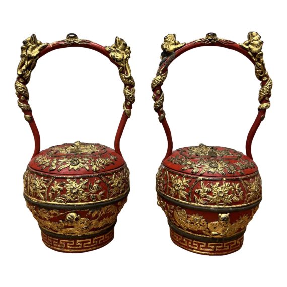 Late 19th Century Chinese Wedding Gift Basket Red Lacquered + Gold Gilt – a Pair. Original Price: $2,000