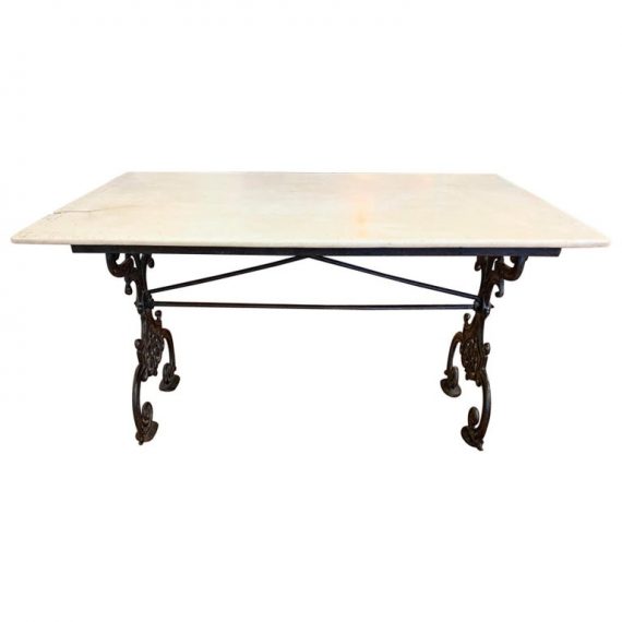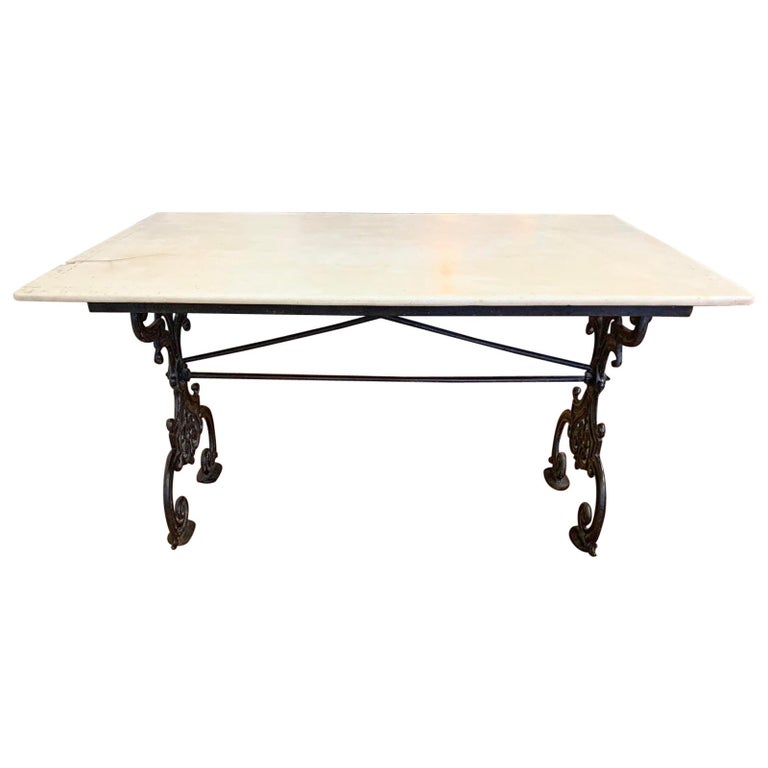 Design Plus Gallery presents a Late 19th-Century French Cast Iron Garden Table with Marble Top, circa 1880. This table from the Napoleon III period has a very elaborate scrolled base that was refinished with a black coating and a marble top. Carrera Marble top has visible wear and a crack on the side.