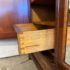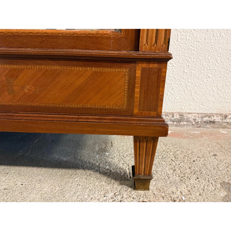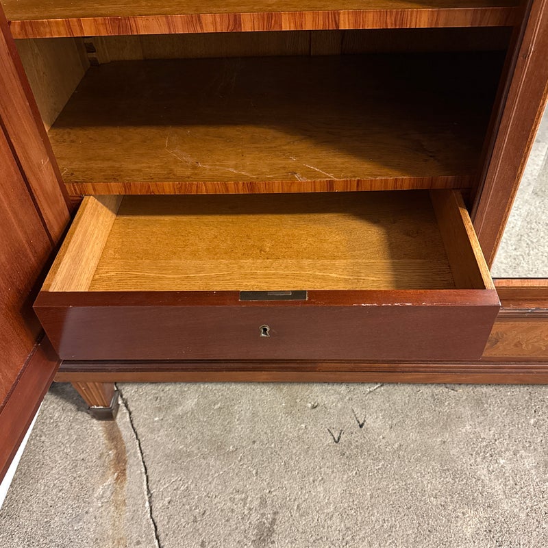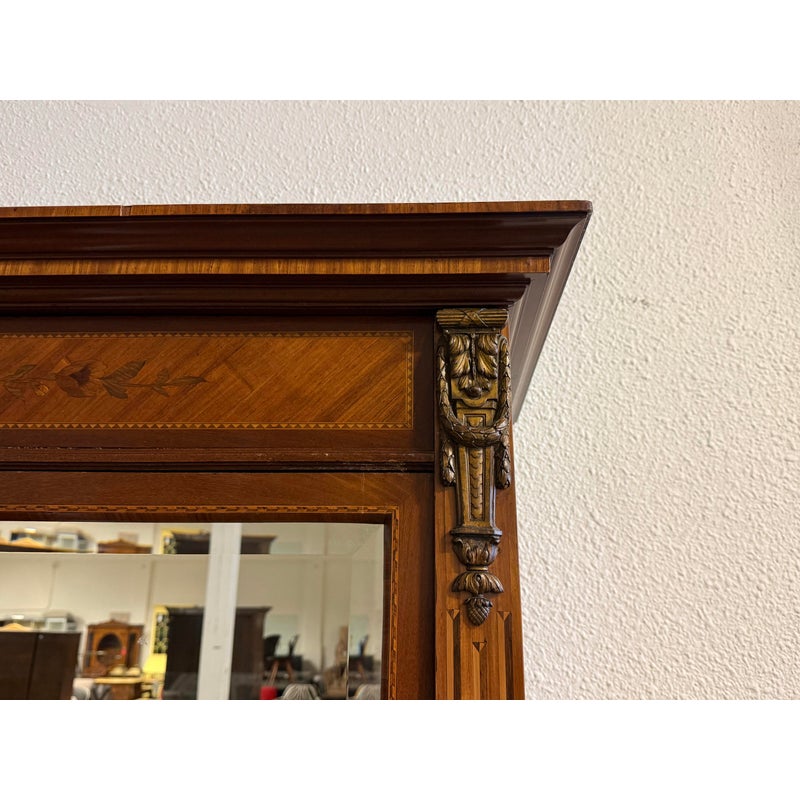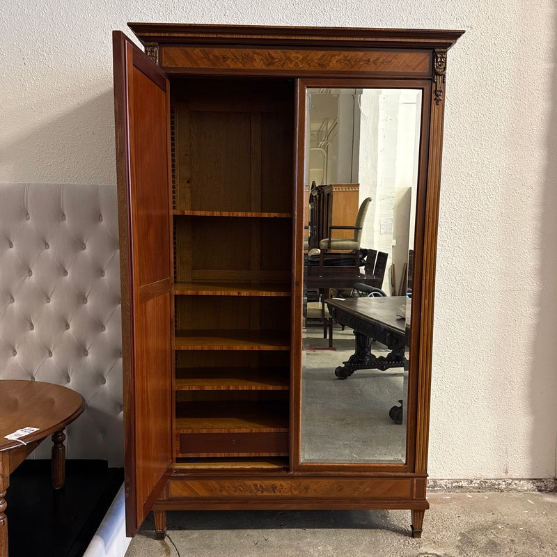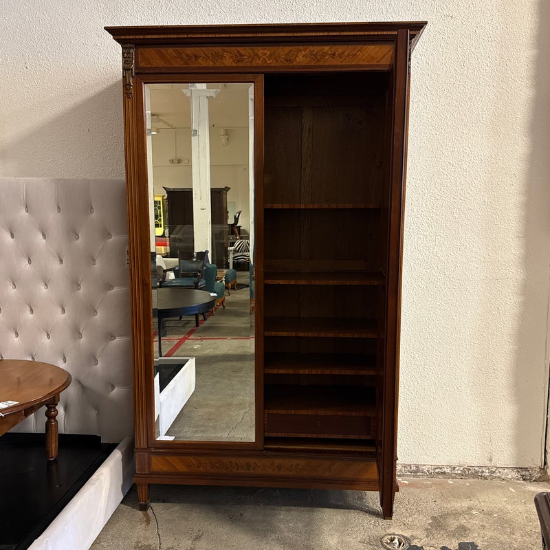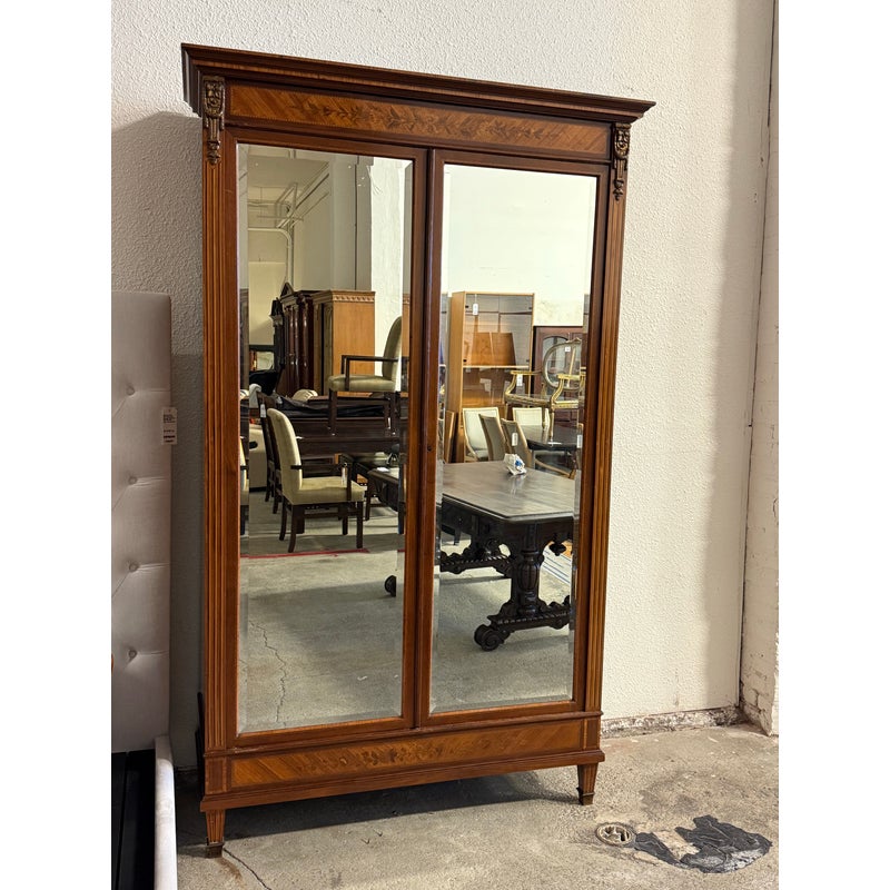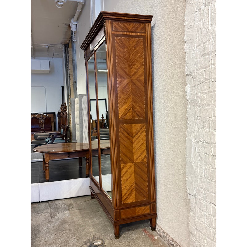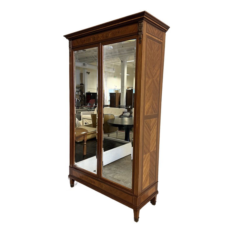 Design Plus Gallery presents a French Walnut Louis XV Armoire from the Late 1800’s. The antique armoire is exceptionally refined with nearly all consuming mirrored pocket doors that are front + center. Definitely striking, and wonderful in that they slip right into the cabinet when the inside of the armoire needs to be used. Four of the shelves inside are of solid wood and can be placed anywhere or removed completely. Two lower drawers are concealed at the base of its interior. Surrounding the perimeter of the outside of the cabinet is inlaid work of exceptional beauty, brass ormolu at the upper top corners, tapered legs with brass capped feet, and elegant parquet wood. This item was retrofitted. Is in good condition for its antique age + use. Does not come with a Key.