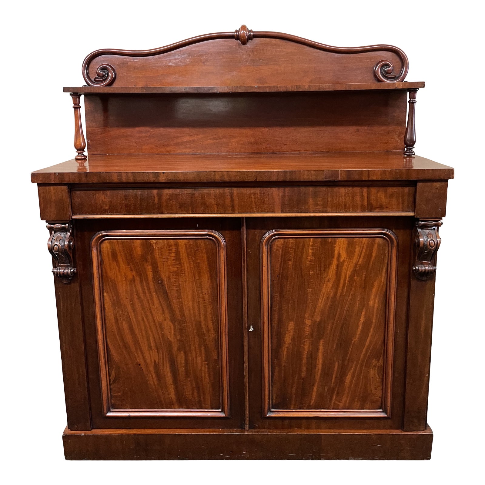 Design Plus Gallery presents a Late 19th-Century Tiger Flame Mahagony Chiffoniere Cupboard. Beautiful wood surfaces showcase the drama + depth of the cathedral inlay on the doors. Interior of base has a generous open storage space with fixed shelf. Cabinet doors lock with a key. Generous bar height space has a shelf with turned supports and a lovely curved detailing. Visible wear through out due to age, unit is in good condition.