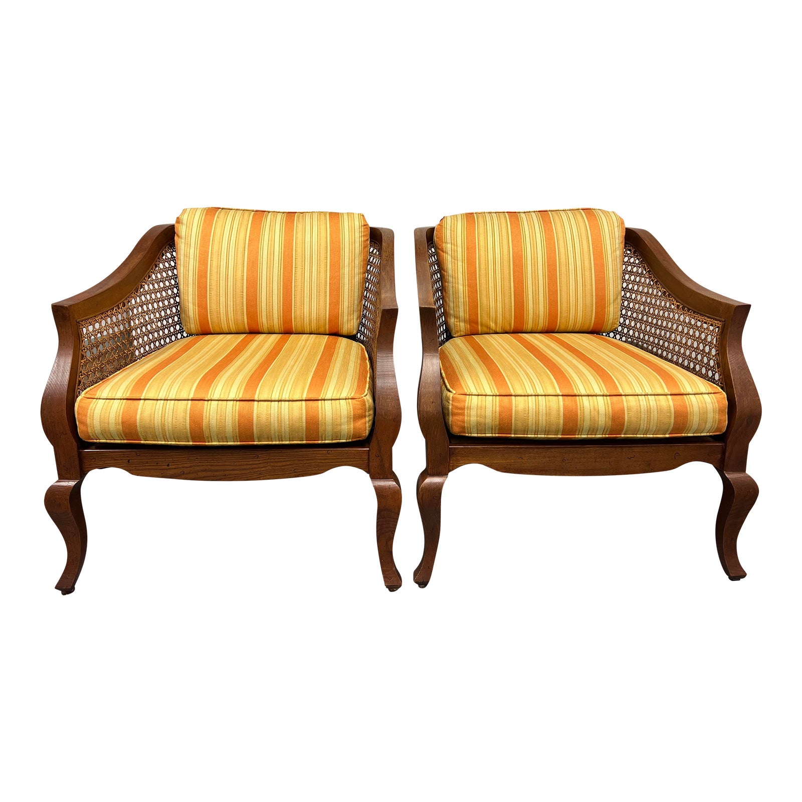 Design Plus Gallery presents a Pair of Traditional Cane + Curved Arm Chairs with Striped Orange Cushions by Debu Furniture. Cane + wood frame is stained a rich chestnut tone and has traditional flair with the French inspired legs + silhouette. There is minor wear through out, chairs are in good condition. Cushions are removable and filled with dacron. Fabric is a warm and bright yellow + orange stripe.