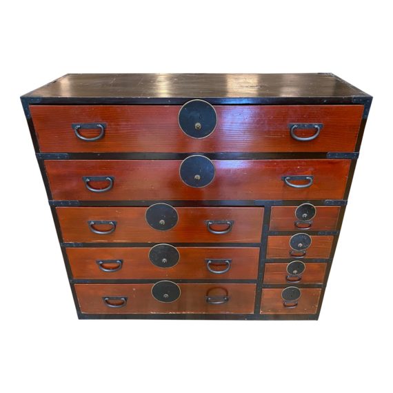 Design Plus Gallery presents a Late 20th Century Asian Tansu Chest. Crafted from solid woods. A multi finish of black and rustic reds. The hardware is iron. Visible wear and cracking due to aging and usage.