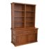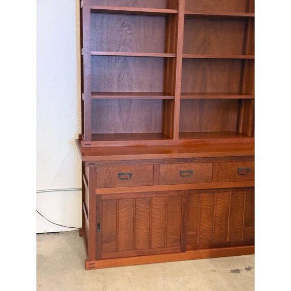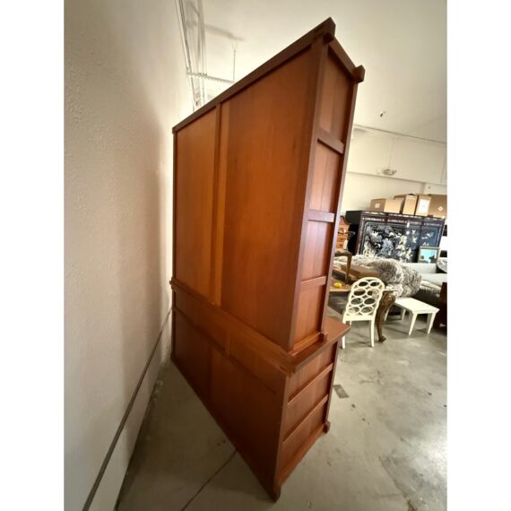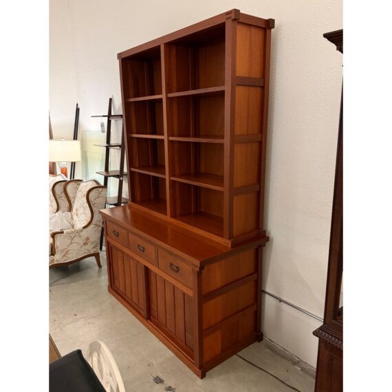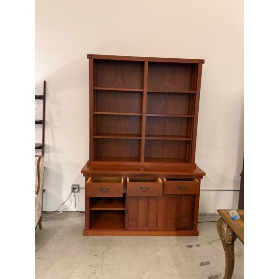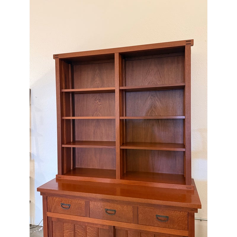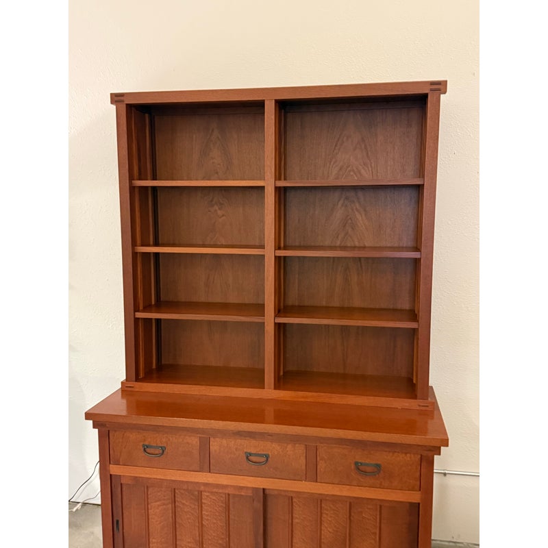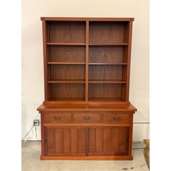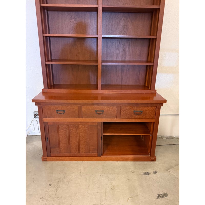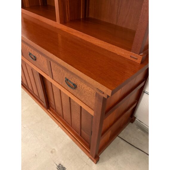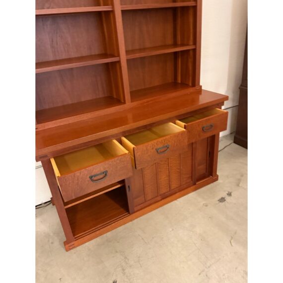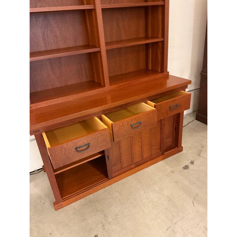 Design Plus Gallery presents the Honduras Mahogany Wood China Cabinet from Berkeley Mills. An exceptional showmanship of craftsmanship, this cabinet offer solid wood construction with a stain that is especially popular in Arts & Crafts furnishings, as well as mimicking Japanese and is desirable in Victorian to rustic. The two piece cabinet has upper shelving of double exposure of four shelves, eight total. The lower section has three drawers with iron handles that are equal in their dimensions. The lower cabinet doors slide with a single shelf inside to divide the cavity space. This style is no longer in production with the brand. It is in good condition with many years, decades, if not centuries left in its lifetime. Made in the USA.