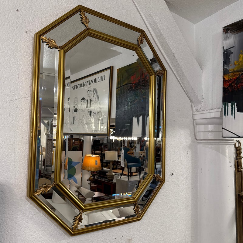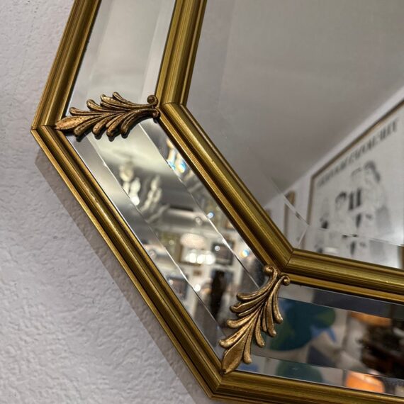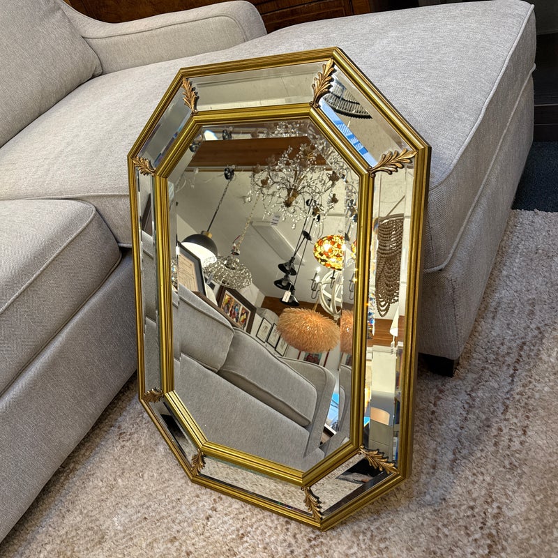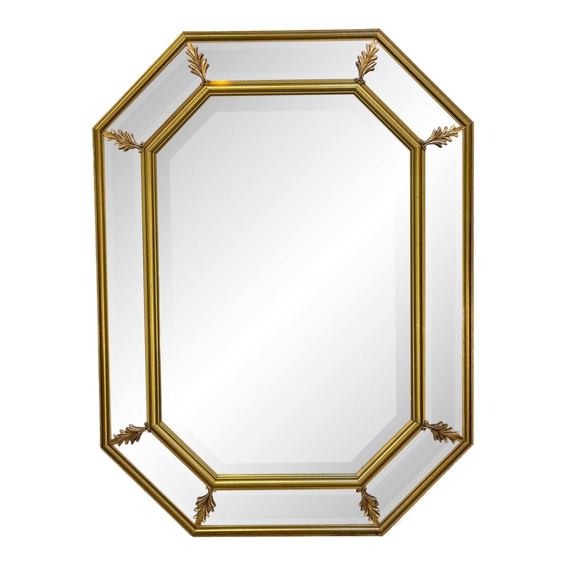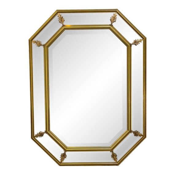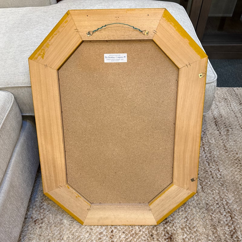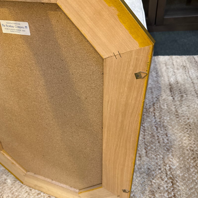 Design Plus Gallery presents a Florence Wall Mirror from Bombay Company. Inspired by classic Italian design, features beveled glass panels that gleam with every shift of light, creating a sense of depth and luxury. The unique octagonal shape adds visual interest and architectural flair, while the ornate gold gilt frame—highlighted by intricate, decorative corner accents—brings an air of timeless sophistication to any setting. Perfect as a statement piece in your entryway, living room, or bedroom, the Florence Wall Mirror embodies refined elegance and enduring style, making it a cherished addition to both traditional and contemporary interiors. This model is discontinued from the brand. In good condition, visible and minimal wear from usage. Made in Italy.
