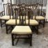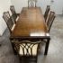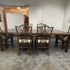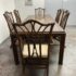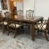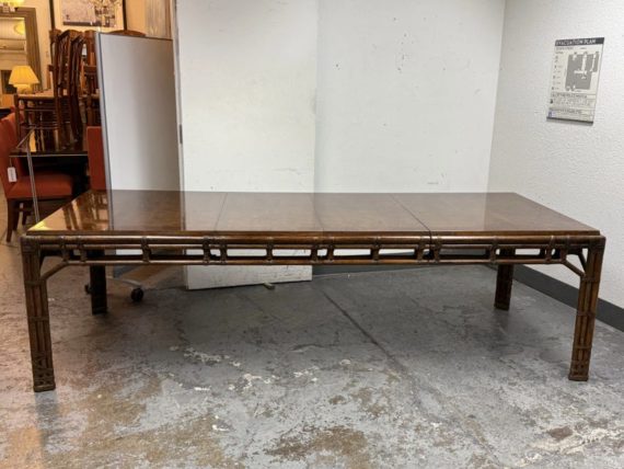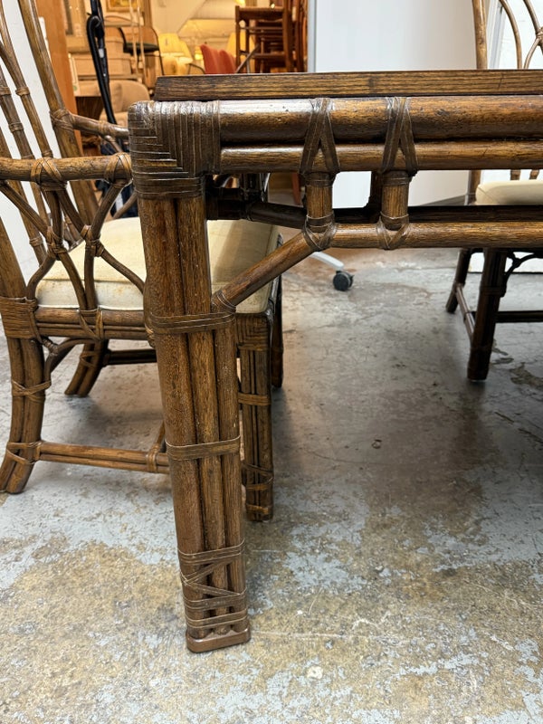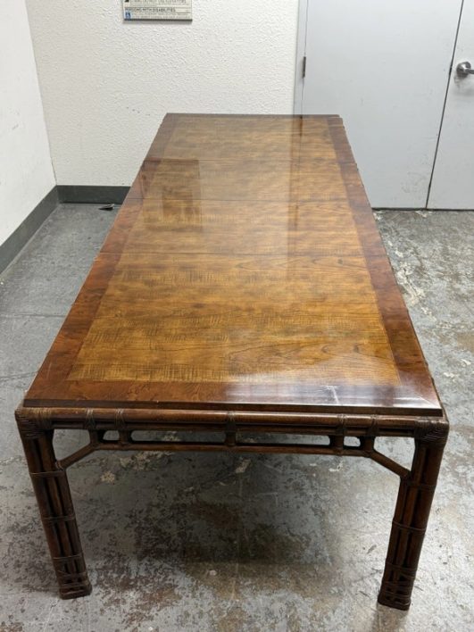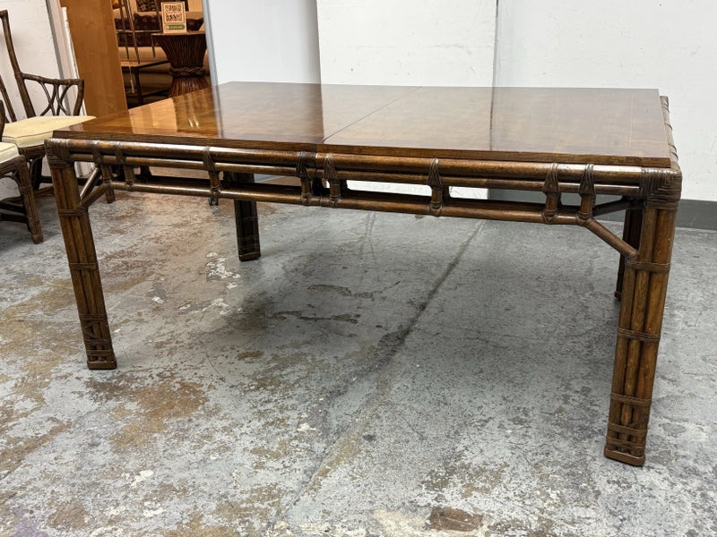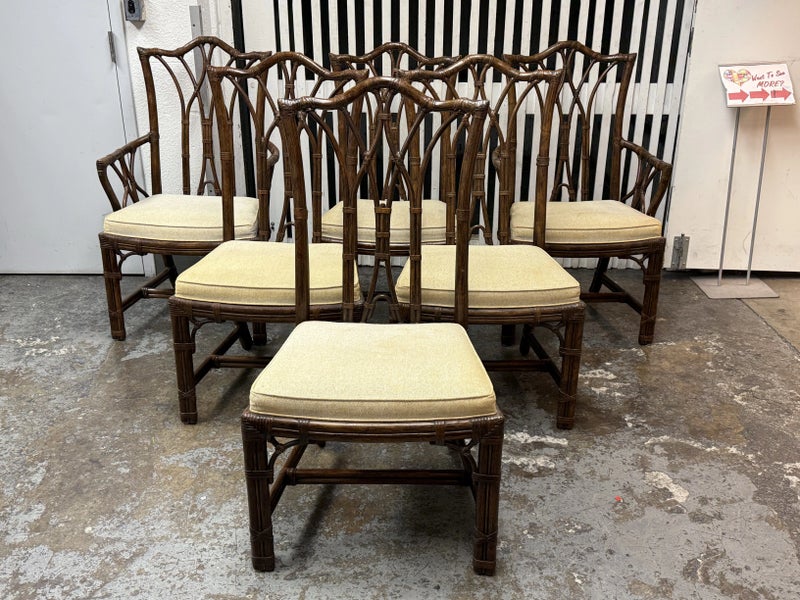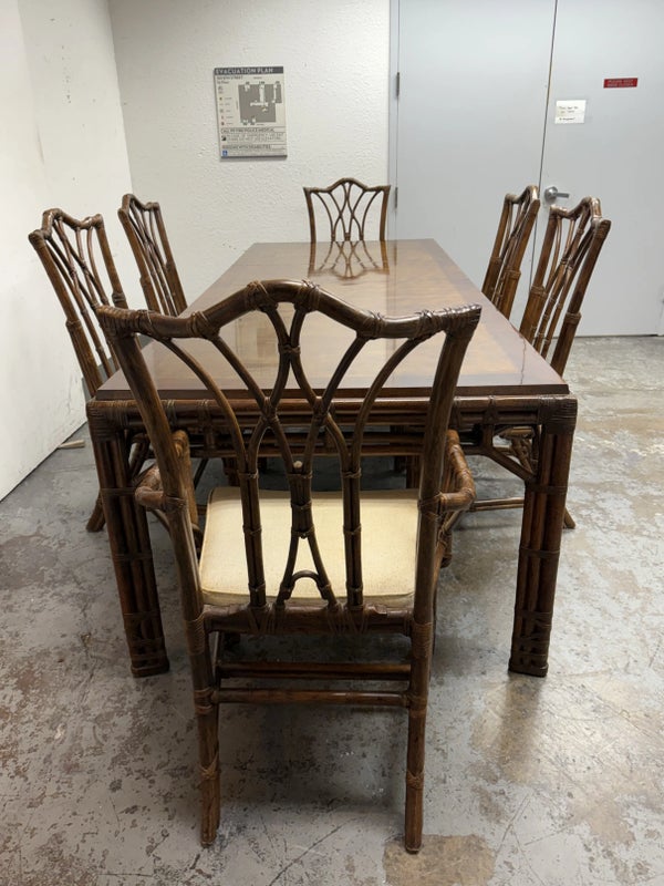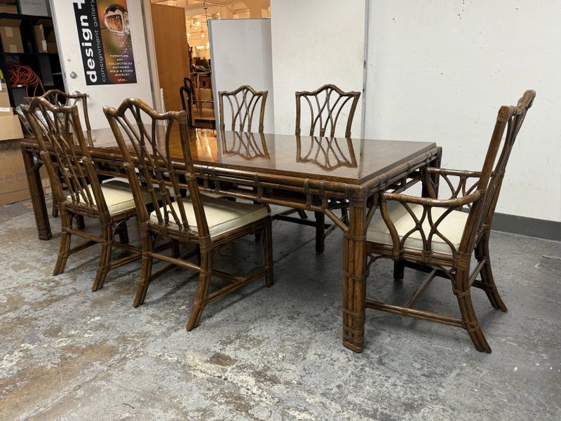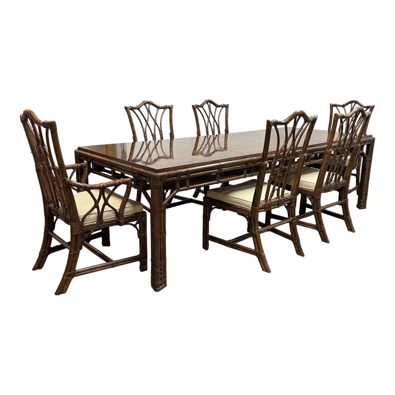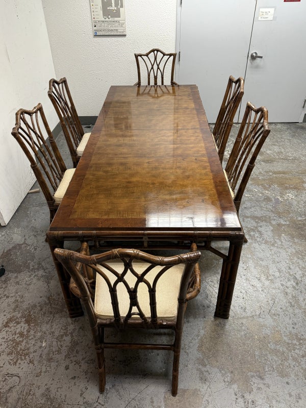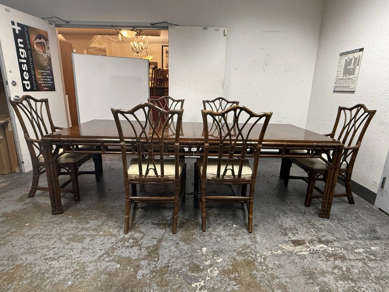 Design Plus Gallery presents a Dining Room Set Design by Chin Hua for Century Furniture in the Late 20th Century. The table provides an overall orient inspiration with the table offering faux bamboo wrapped rods making up the dining table frame. Two extensions can be added to increase dining area an additional 40 inches. There are two arm chairs and four side chairs in the cathedral like style, also made up of faux bamboo rods. The set does show signs of wear and age, they are considered good condition that is consistent with their age + use.