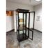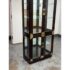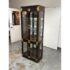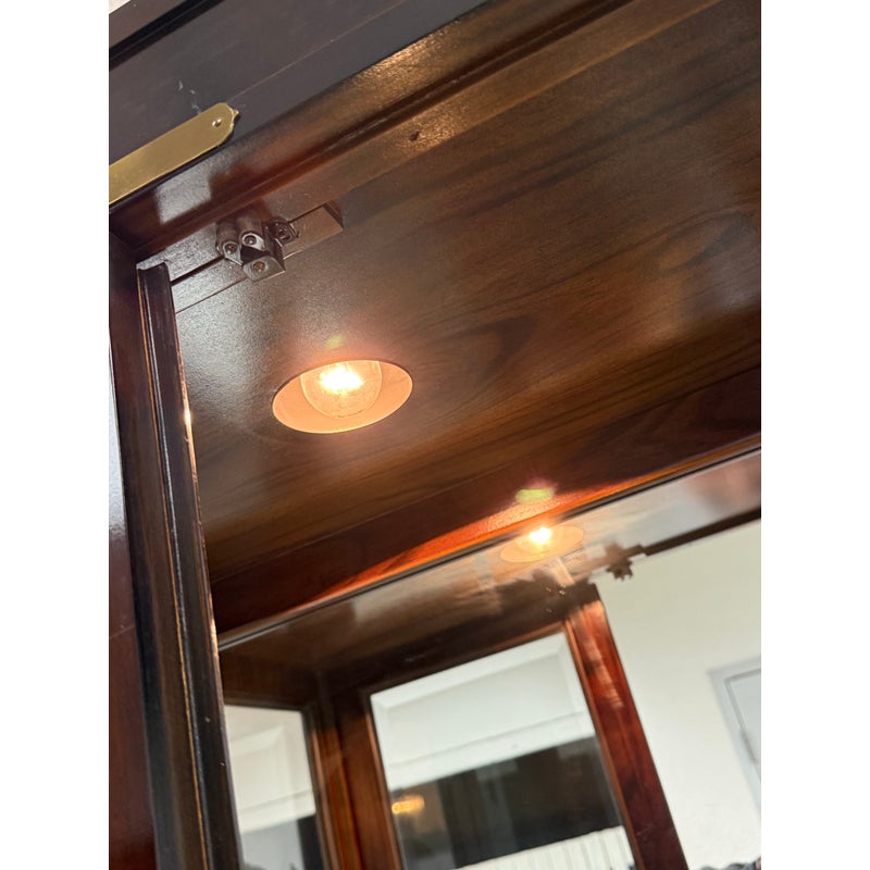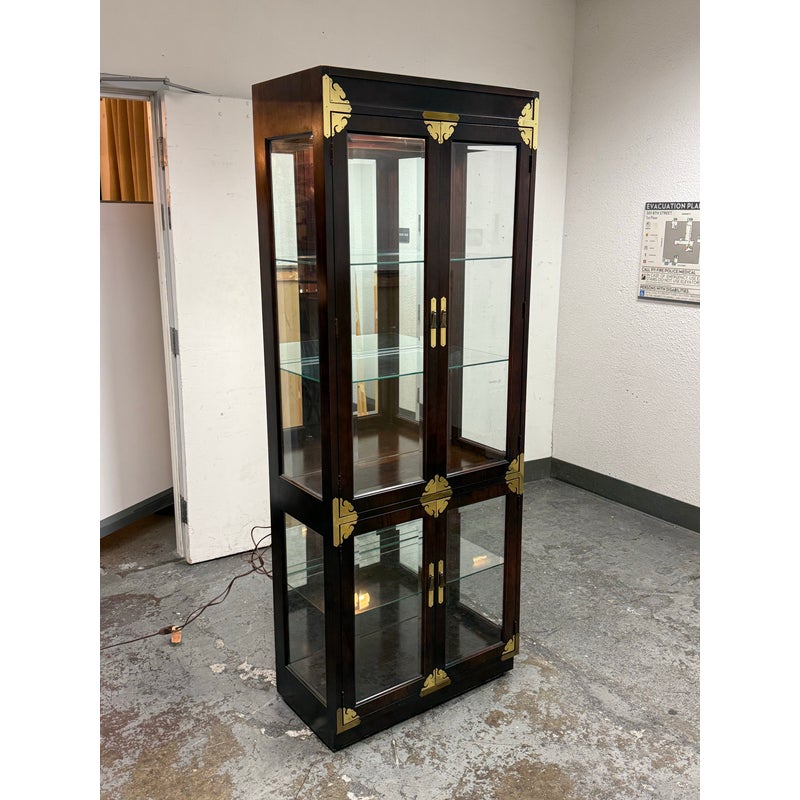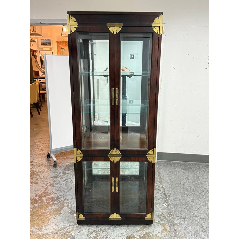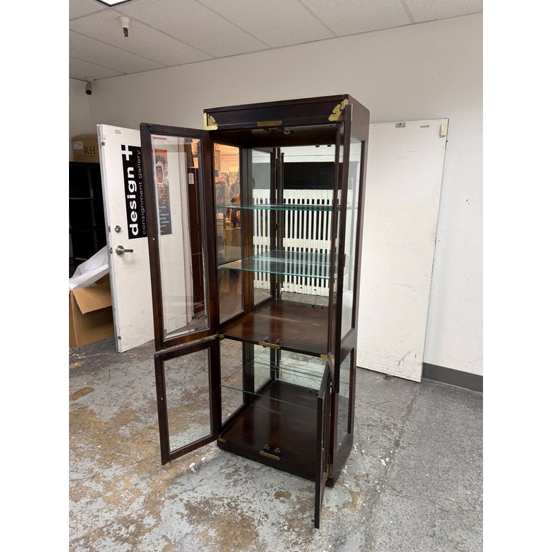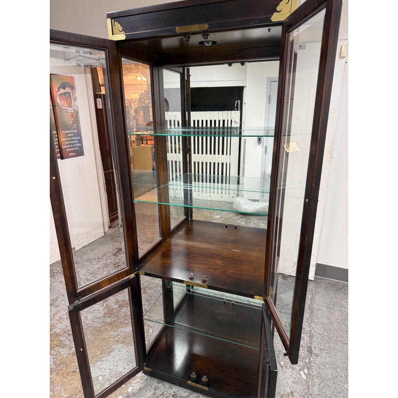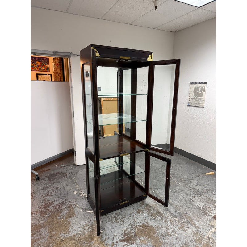 Design Plus Gallery presents a Chinoiserie Curio/Display Case from the Late 20th Century. An elegant blend of traditional influence with refined craftsmanship. The curio is made from solid wood and veneers. The polished brass accents, including decorative corner mounts and hardware, provide a striking contrast to the tone of allover finish that emphasize its chinoiserie-inspired design. The case is fitted with two glass panel doors that open to reveal a well-appointed interior with a mirrored backing and a total of three glass shelves with one fixed wood shelf, So much to offer with its versatile display options for collectibles, porcelain, books, or decorative objects. There is a single overhead interior light softly illuminates the contents. This is a discontinued model and is in good condition with visible and minimal wear from usage.