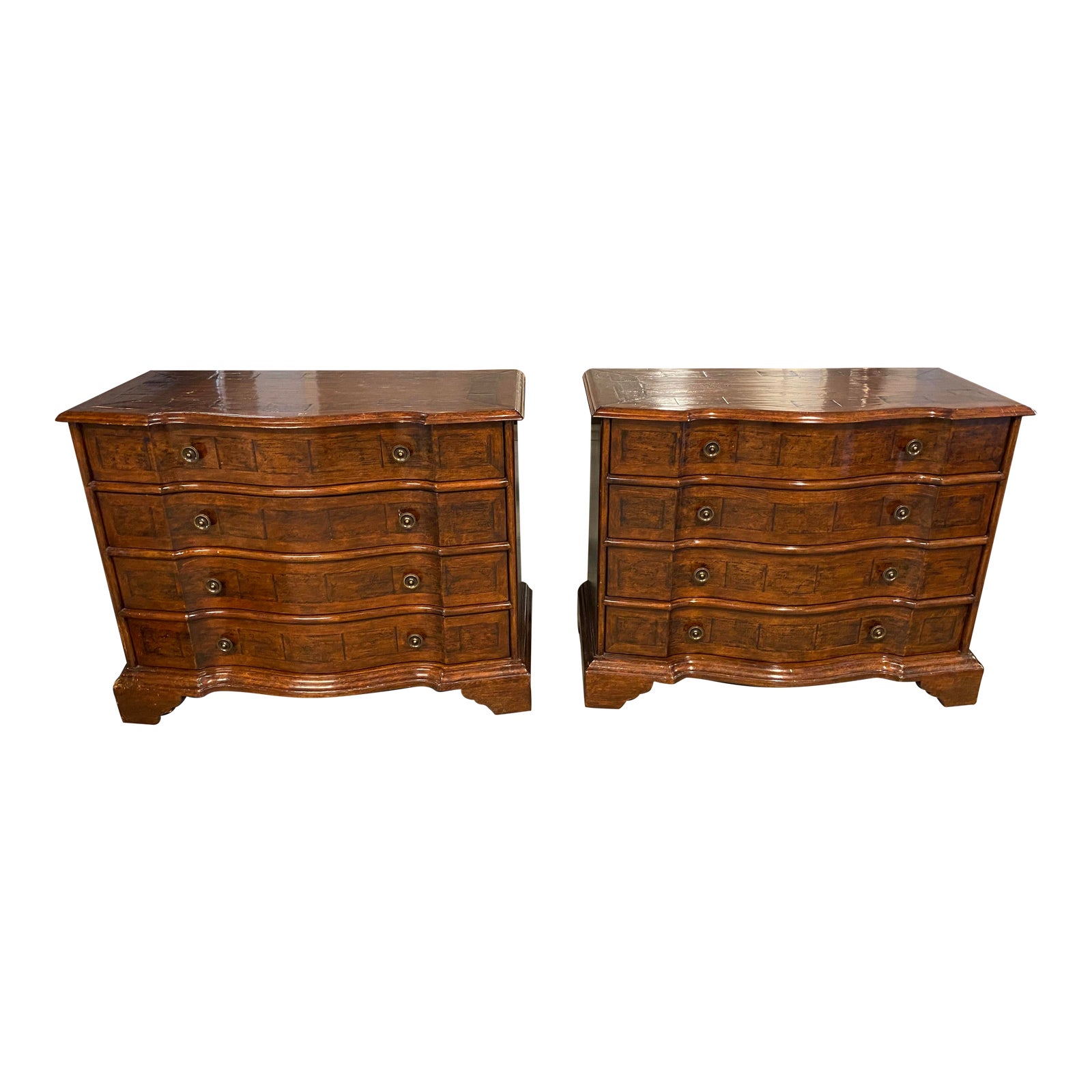Design Plus Gallery presents a Pair of Custom Design Antiqued Four Drawer Dressers. Solid wood frame is finished with a satin and subtly reflective stain finish. Chestnut stained wood is darkened with antiquing. Drawers have the relief of a decorative molding inset with antiqued finishing. Oiled brass pulls adorn each drawer. Drawers are made with a smooth soft close mechanism.Visble and minor wear on surface. Face of unit has a curvature similar to a French antique.