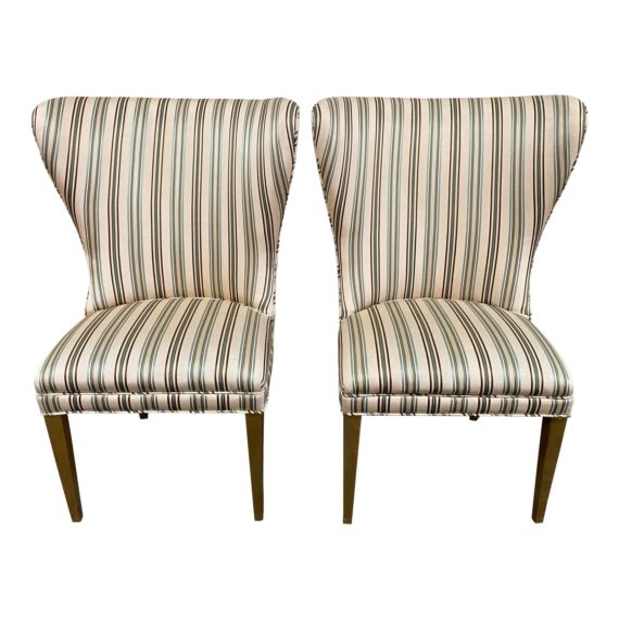 Design Plus Gallery presents a pair of Late 20th Century Side Chairs. Strong stripes of turquoise, khaki and green against an ivory background, and self welting add to the drama of these chairs. A high back and tapered gilt-finished legs continue the elegant style.