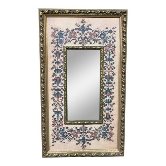 Design Plus Gallery presents a Late 20th-Century Eastern European Floral Wall Mirror. Painted floral border is printed on a textured surface within the traditional gold frame. Another frame within the border encapsulating a mirror. Minor wear on surfaces. Wire on back is ready hanging in both horizontal and vertical direction.