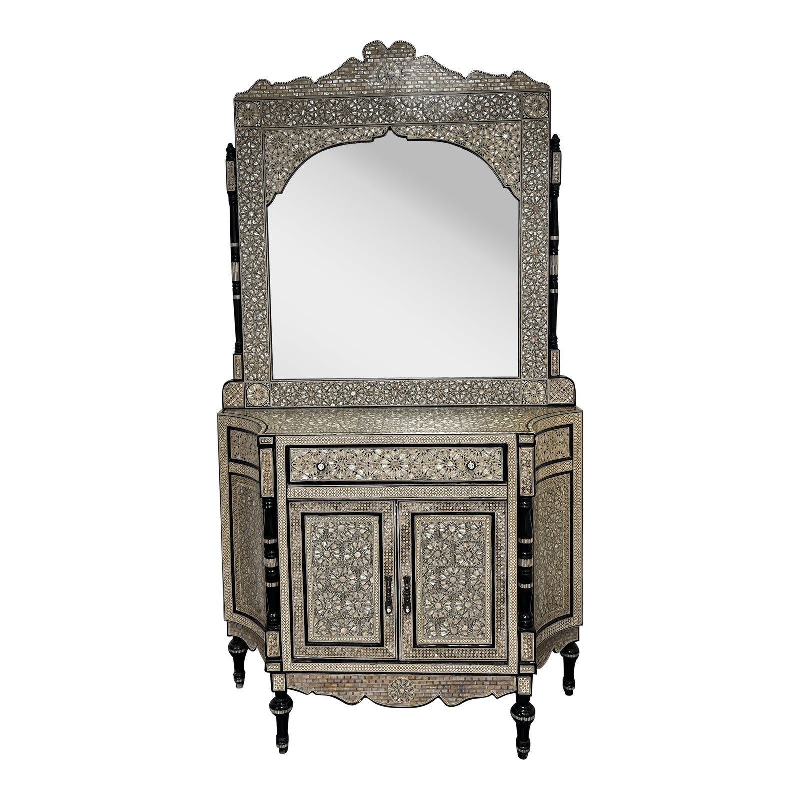 Design Plus Gallery presents an Egyptian Bone + MOP Demi Mirrored Cabinet. Originally purchased at an Egyptian trade show hosted by representatives of the The Egyptian government. The pieces from this collection have been very well taken care of and showcase an incredible display of Mother of Pearl inlay, fretwork + wood craftsmanship. The Moroccan star motif radiates in contrast withe the warm neutrals and black contrast. Interior of drawer is lined with a red fabric. There is visible wear through out, cabinet + mirror are in good condition. The key is missing.