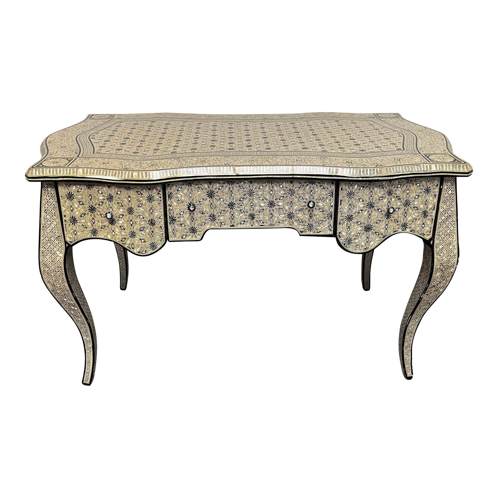Design Plus Gallery presents an Egyptian Bone + Mother of Pearl Desk. Originally purchased at an Egyptian trade show hosted by representatives of the The Egyptian government. The pieces from this collection have been very well taken care of and showcase an incredible display of Mother of Pearl inlay, fretwork + wood craftsmanship. Every surface of the French inspired silhouette is paid attention to, even down to the beveled edges. The Moroccan Star motif radiates in black ivory, + cream contrast. Each pane is accented with a black outline. Interior of the drawers are lined with a red fabric. There is visible + minor wear through out, desk is in good condition.