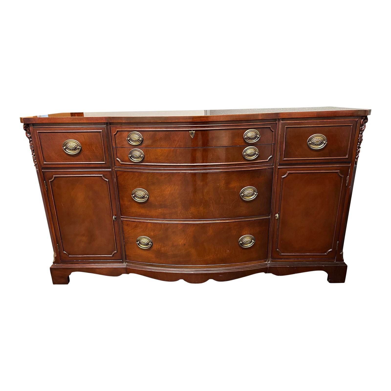 Design Plus Gallery presents a Late 20th Century Ethan Allen Colonial Sideboard. Lovely moldings and carvings adorn the sideboard with oiled brass medaillion hardware. There is visible wear through out, and the original key is missing. Drawers are dovetailed and the top middle drawers are lined with velvet for storing cutlery. Rich wood veneers surround the curved face and sides of the unit for a dynamic depth.
