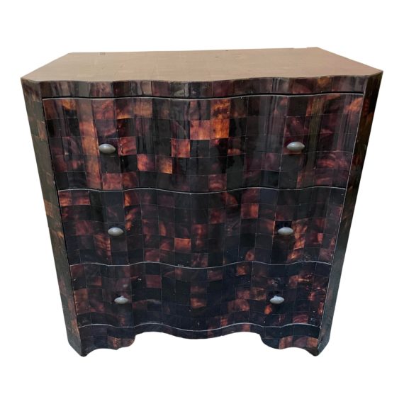 Design Plus Gallery presents a Tortoise Shell Three Drawer Curved Dresser. Patchwork inlay of tortoise shell gives a rich depth to any interior. Scale suitable bed side or as accent storage in another room. Visible wear on the surfaces (pictured.) Good condition overall. Each drawer comes with two satin metal pulls and all drawers are equal in size. Curved face and base has a Moroccan inspired silhouette.
