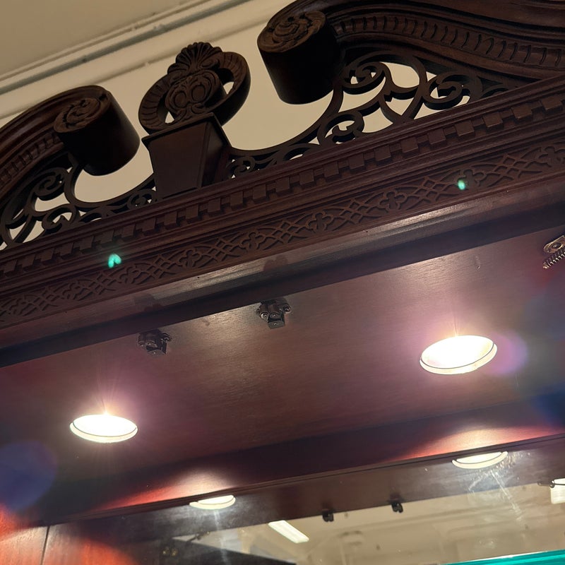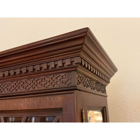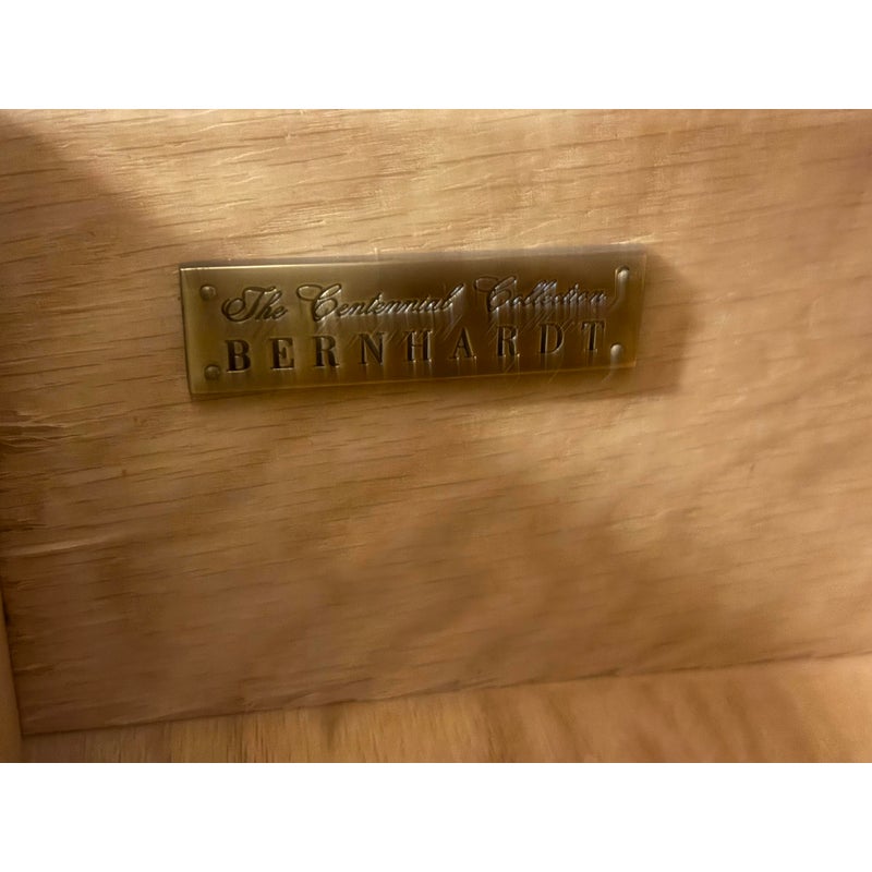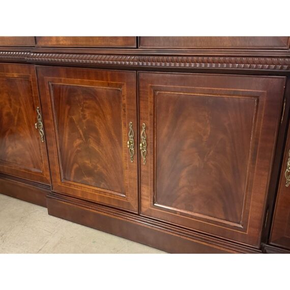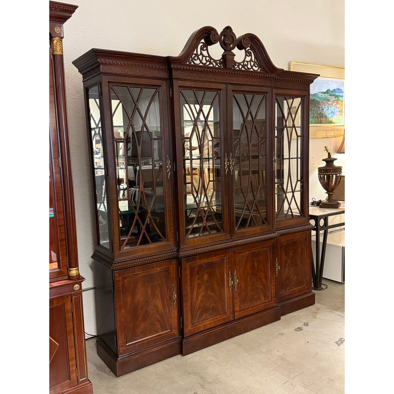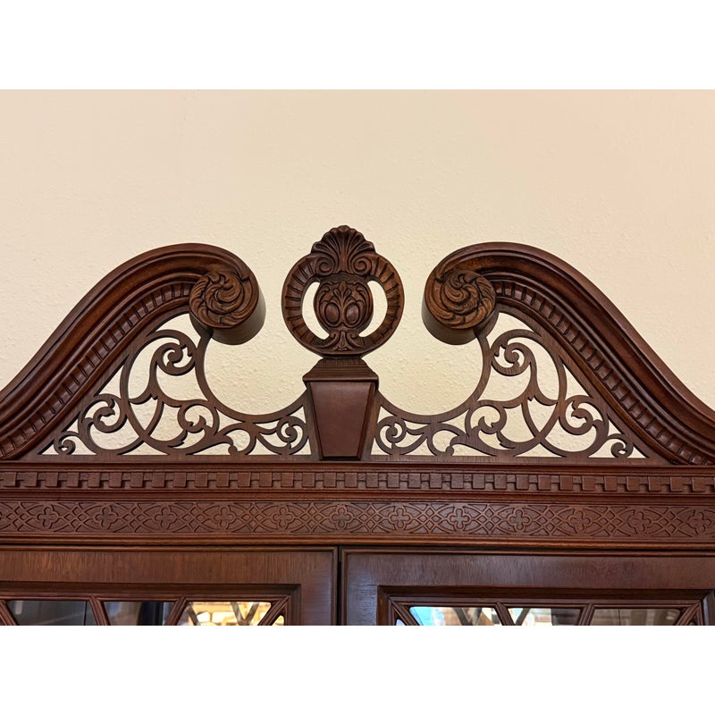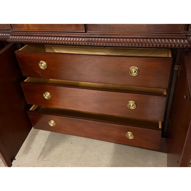 Design Plus Gallery presents the Centennial Collection Two Piece China Cabinet by Century Furniture. This cabinet offers both great storage + display capabilities. The top portion offers all glass storage to display collectibles and/or valuable dinnerware. The base section has cabinet doors that have two in the center that swing open to reveal three drawers while each single side door has a door to split its inner cavity in half. The cabinet is in good condition, wear consistent for its vintage age + use.