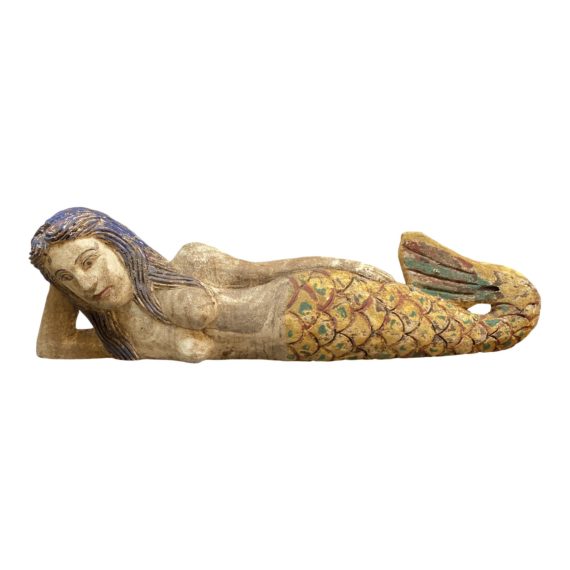 Design Plus Gallery presents a Late 20th Century Mermaid from Bali. Handcarved of wood, and hand painted to charm, the sculpture is an enchanting focal point. Large in scale, pun intended, the mythological spirit of the sea can be yours.