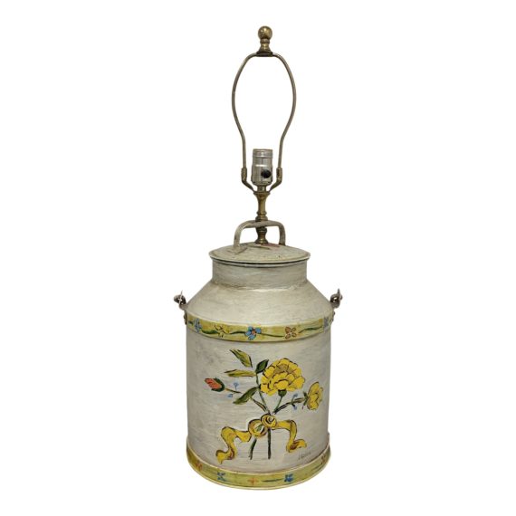 Design Plus Gallery presents a Mid-20th Century Hand Painted Signed A.Fellow Table Lamp. Charming table lamp has been re-purposed with hand painted florals and lamp mechanisms. Finial, center and hard are an oiled brass. Visible wear adds to the charm and the base is without a shade. Painted finish has a weathered patina and makes for a shabby chic look.