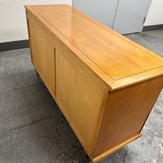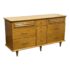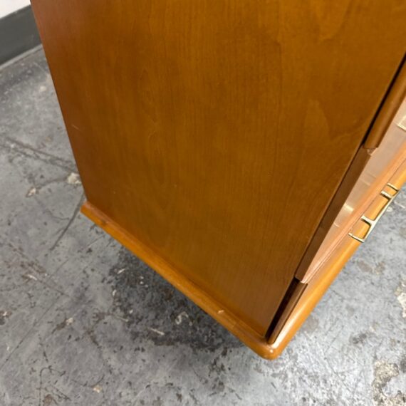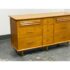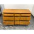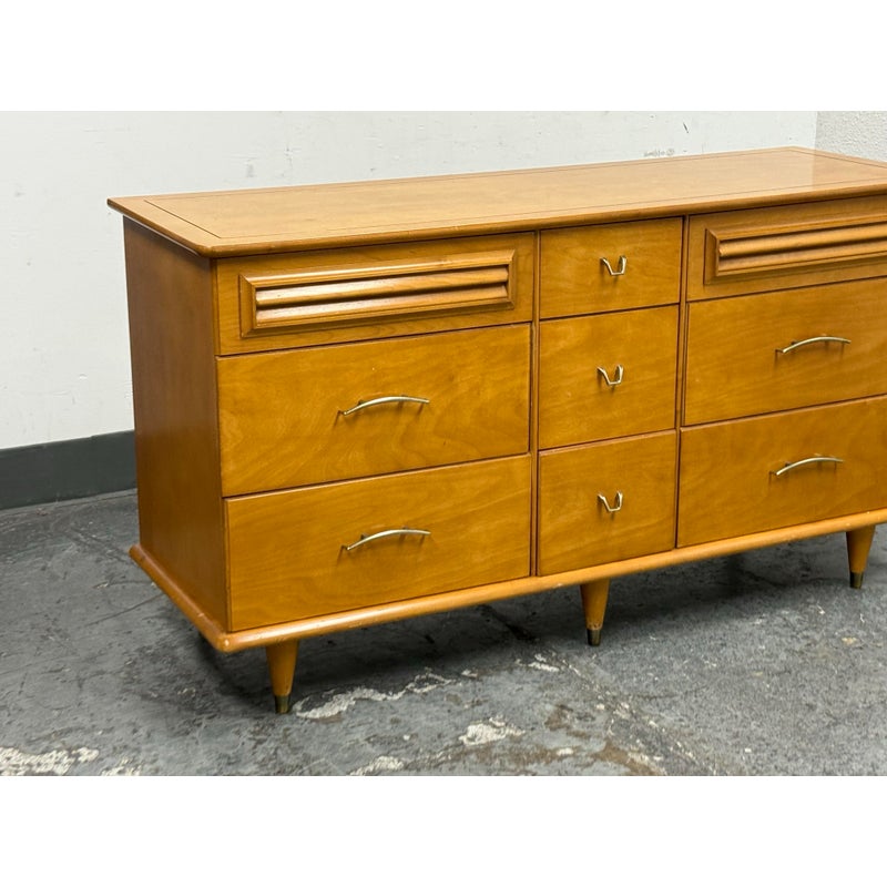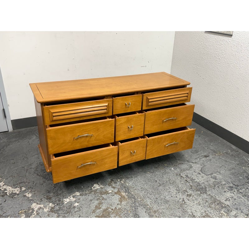 Design Plus Gallery presents a Vintage Honey Brown Toned Lowboy Dresser. This dresser is impressive as it borders on mid century design with some visual interest added that nods towards post modernism. The dresser offers nine drawers total with unique elements to them. The right and left side mirror each other with its two top drawers giving a false front and a more shallow depth is found on the top section than the two lower rows. In the center are three drawers that are narrow and have hardware that resembles hooks in brass. The remaining four drawers to the dressers side have down turned brass rods, also original. Overall this dresser is in good condition with visible wear to finish that consistent with its age.
