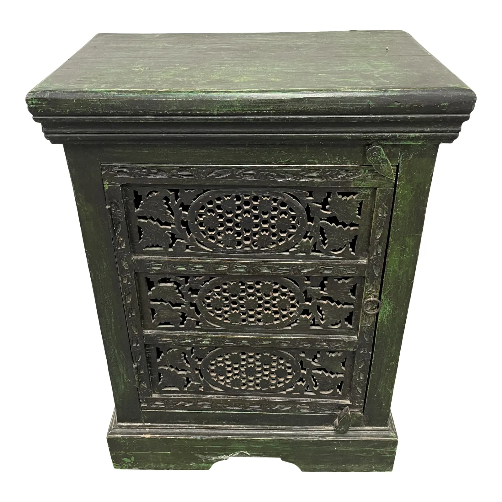 Design Plus Gallery presents an Indonesian Green Cabinet Nightstand. Intricate carvings on the door are framed within three panels with botanical carvings. Wooden latches slide on the top and bottom of the door with a metal pull to access the interior. A single fixed shelf makes up the interior. Visible wear.
