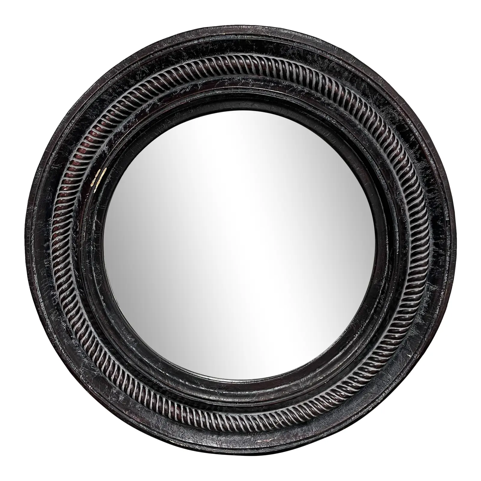 Design Plus Gallery presents a Late 20th Century Large Plaster Round Mirror. With the look of an antique wood mirror, frame is actually made of a lightweight plaster mold. Black finish is weathered with contrasting gray and red undertones. Visible wear through out, good condition.