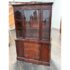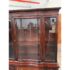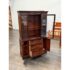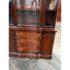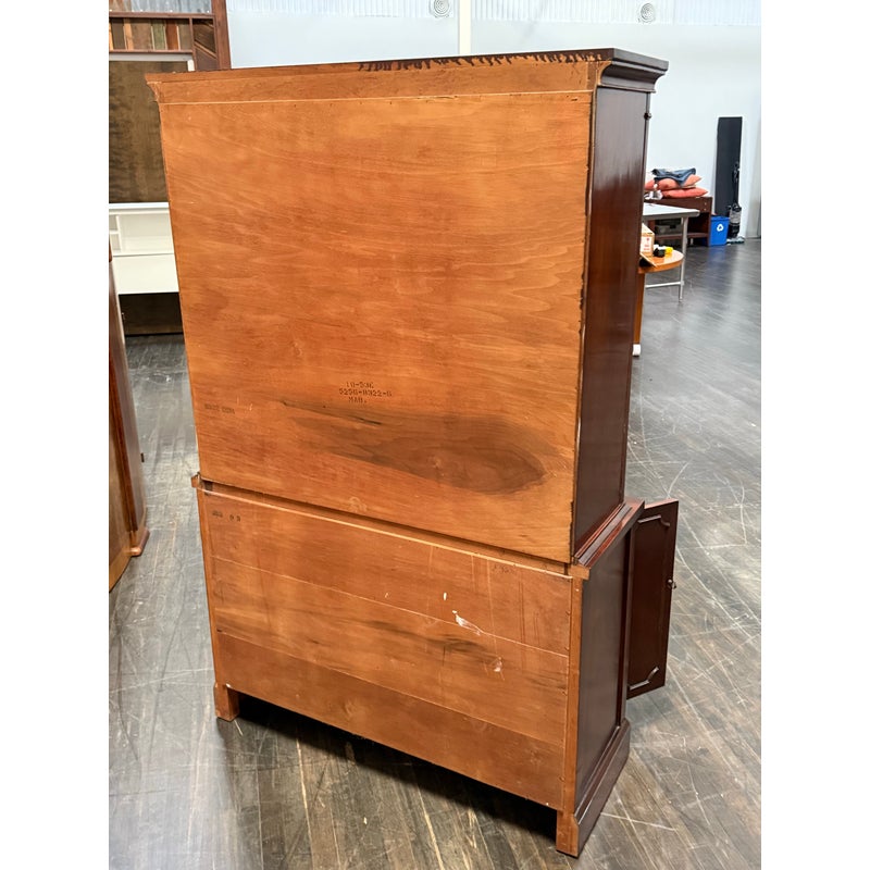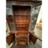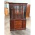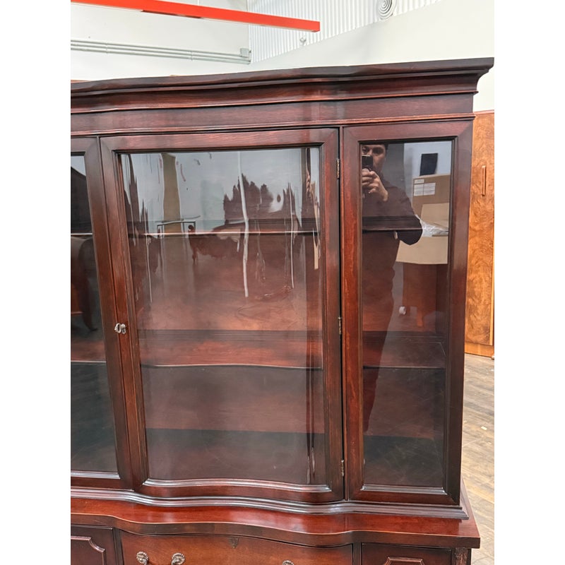Design Plus Gallery presents a Vintage China Cabinet. A fusion of American and Georgian design elements. The upper hutch commands attention with a two glass panel windows with a central door that opens for ease of access. Inside, mahogany finish fixed shelving provides ample space to showcase fine china, glassware, or collectibles. Below, the cabinet features a contoured serpentine front buffet. The lower section offers generous storage, with three smoothly operating drawers set between two paneled doors, each opening to reveal further inner storage for serving pieces, linens, or dining essentials. Traditional brass hardware and elegant moldings highlight the piece’s expert craftsmanship. In good condition, visible and minimal wear from usage.