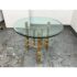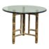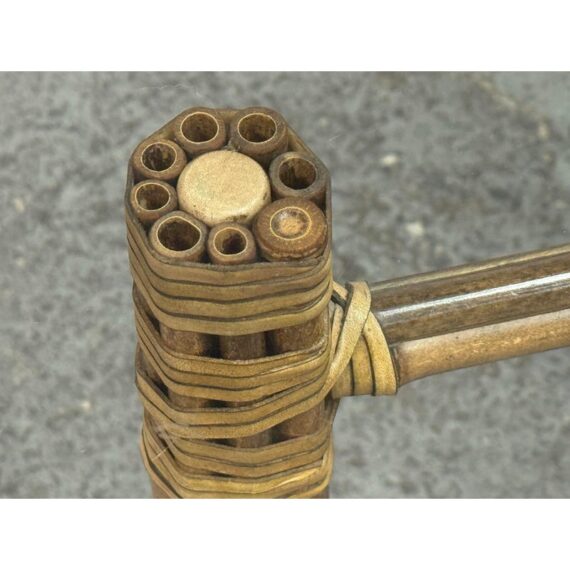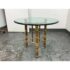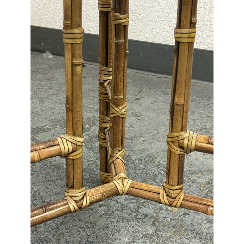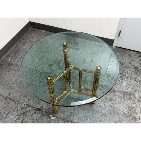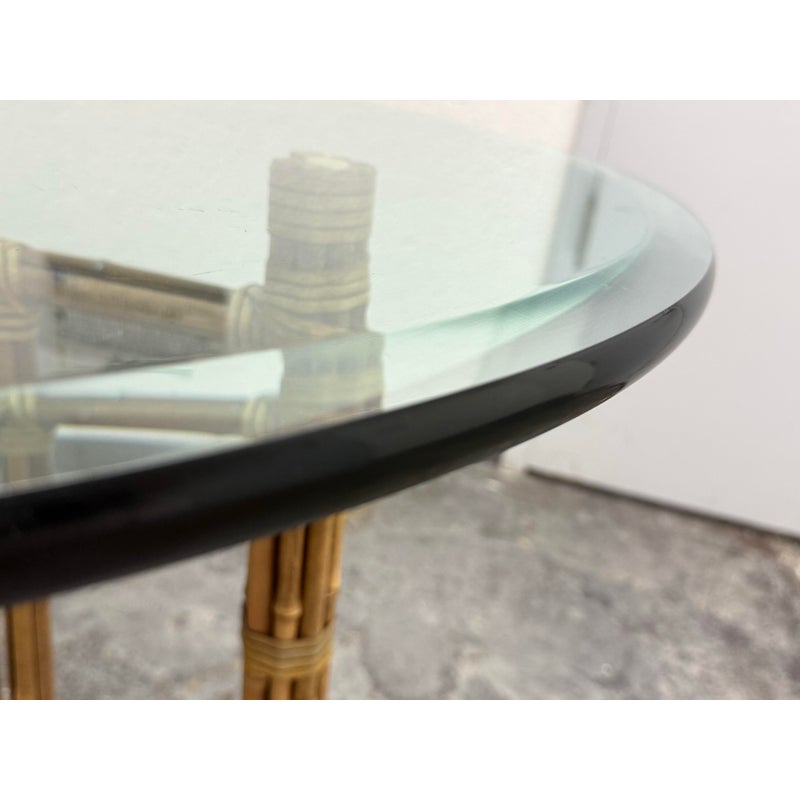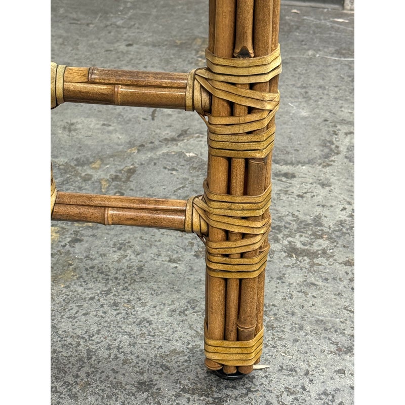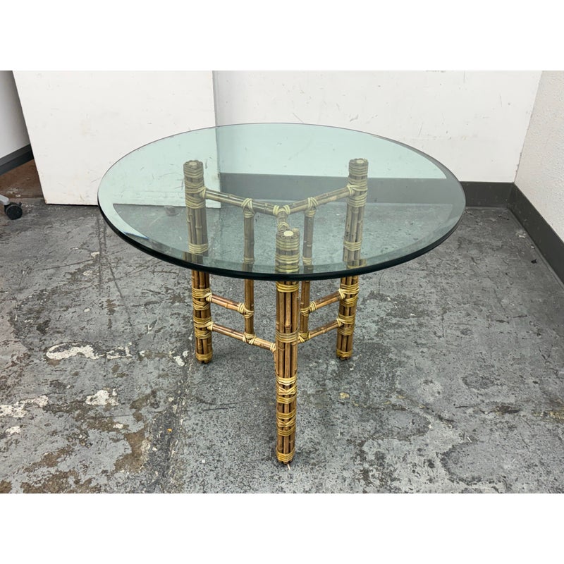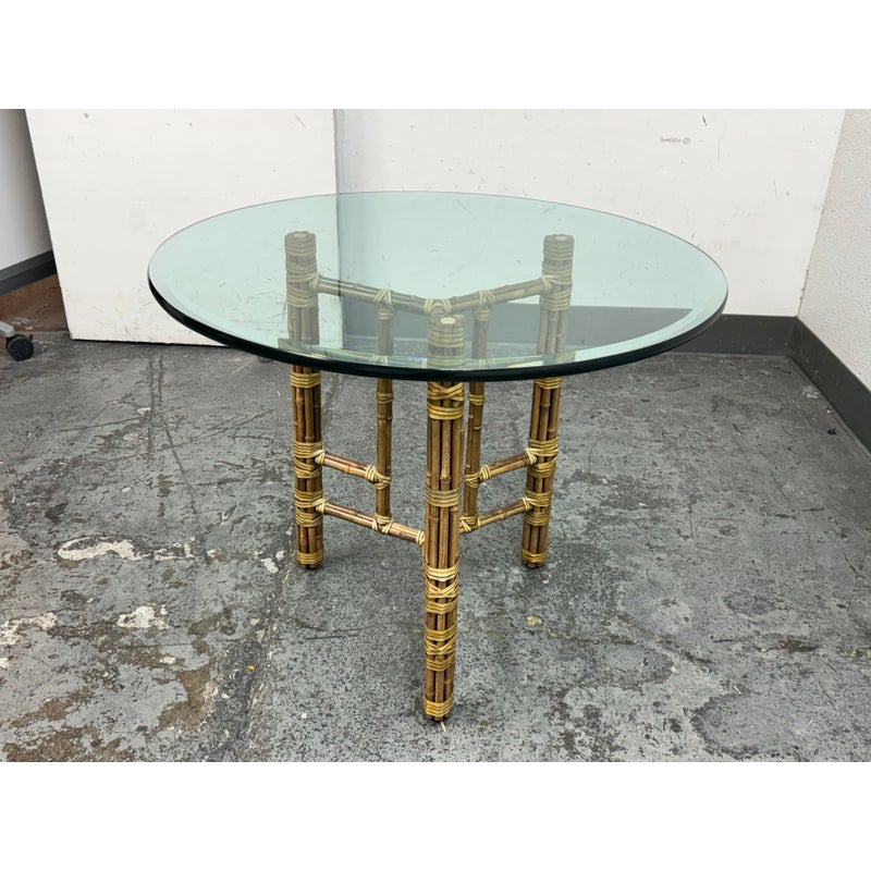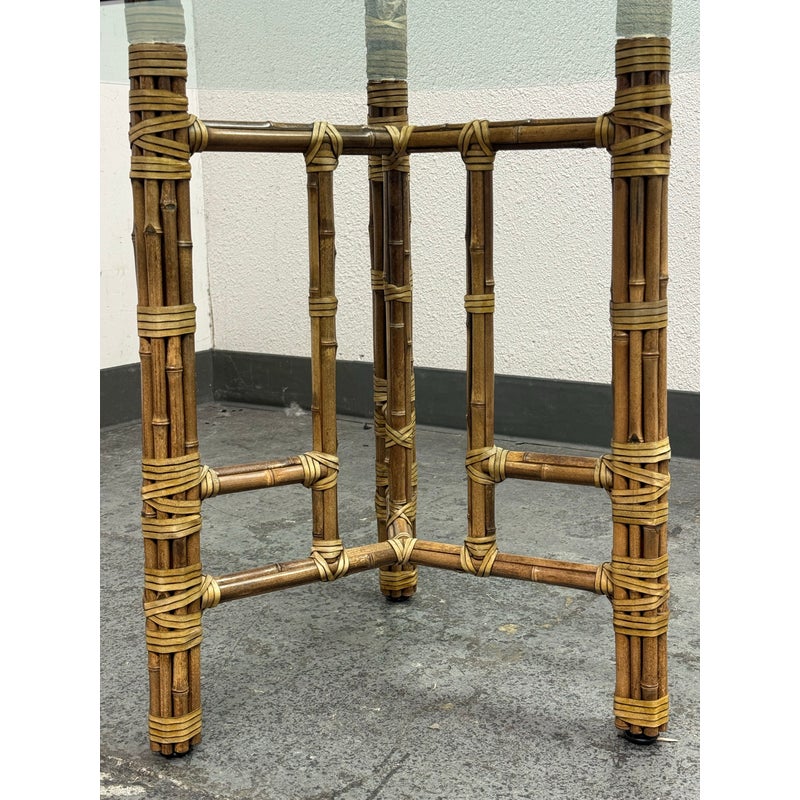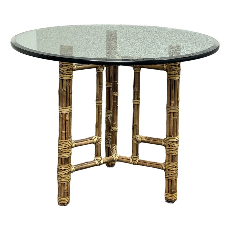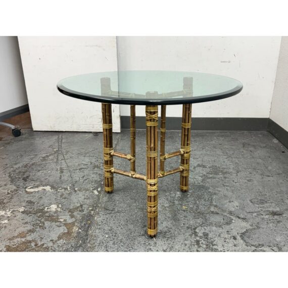 Design Plus Gallery presents a Late 20th Century Round Table from McGuire. An authentic example of the brand’s signature Organic Modern aesthetic, combining natural materials with refined craftsmanship. The table features a sturdy iron frame base that is fully wrapped in bamboo poles, a hallmark of McGuire’s construction techniques. The bamboo elements are secured at the joints with hand-tied leather rawhide lacing. The round beveled glass top complements the sculptural base, providing a light, elegant surface that allows the intricate bamboo framework to remain visually prominent. Minor wear consistent with age and use may be present, including subtle variations in bamboo tone, light surface wear to the glass, and natural patina to the rawhide lacing. This is a discontinued model. In good condition, visible and minimal wear Made in Philippines.