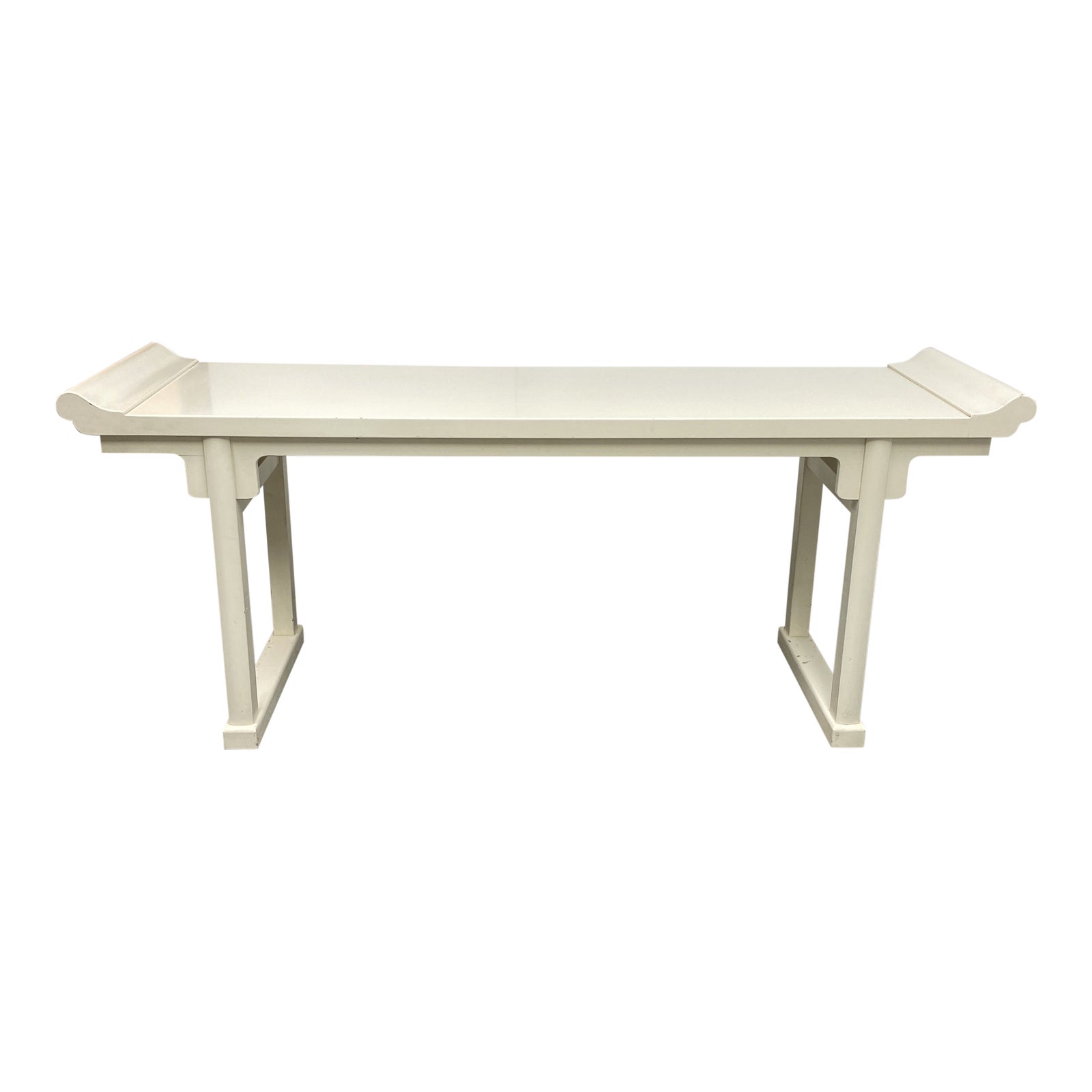 Design Plus Gallery presents a McGuire Pagoda console. Table has retained it’s original lacquer due to it’s craftsmanship. There is visible wear on some of the surfaces (pictured.) Table has an excellent ivory color patina with some faux distressed areas. Console has the McGuire label on the underside.
